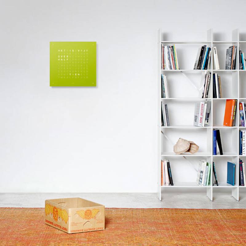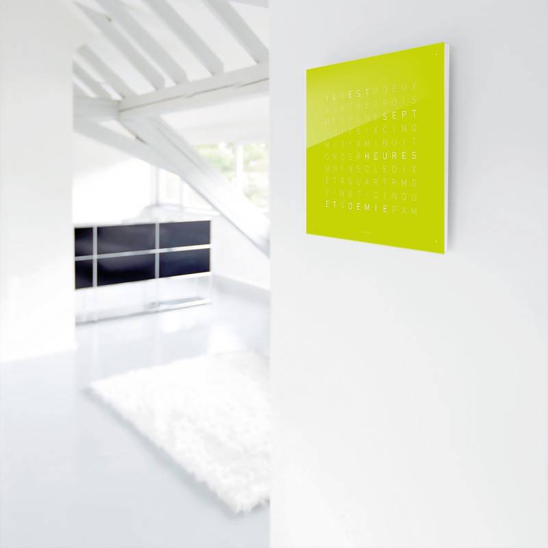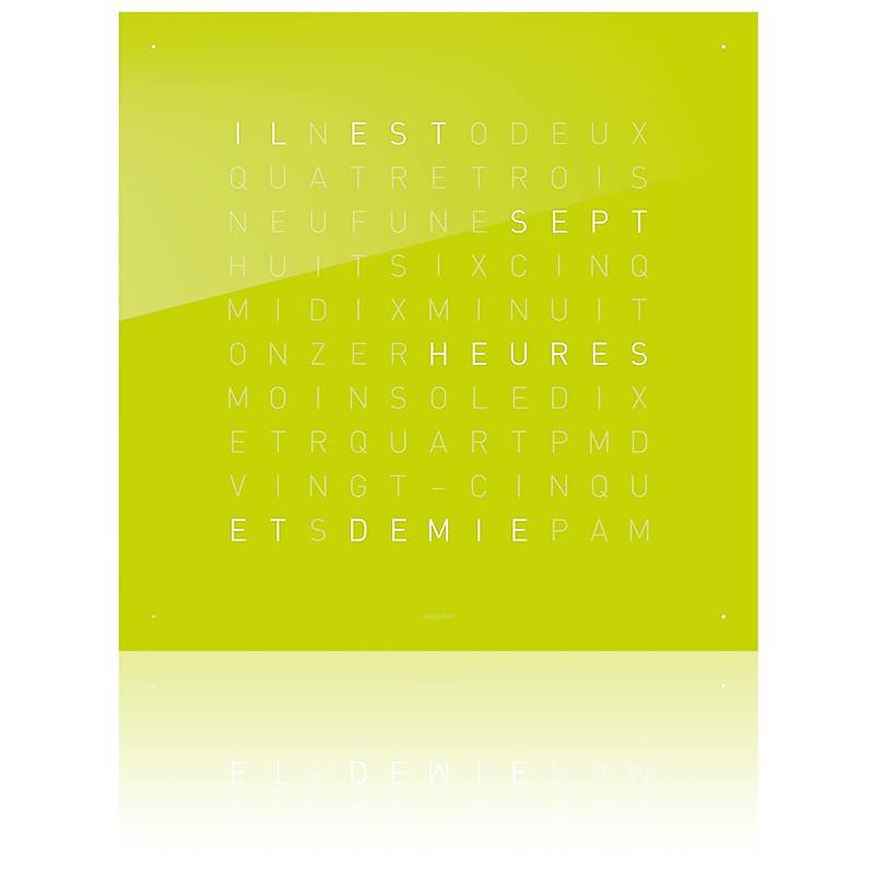 Horloge murale ou sur pied, au format 45 x 45 cm en bois laqué à plusieurs couches. La face de QLOCKTWO est maintenue par des aimants, sans éléments de fixation visibles. On peut de cette manière l'échanger facilement. Il existe en acier inoxydable brossé ou en verre synthétique, poli disponible en sept coloris.