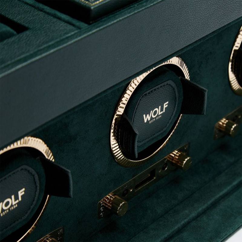 La maison Wolf 1834, spécialisée dans la conception d'accessoires de luxe pour bijoux et montres vous propose de découvrir son sublime remontoir British Racing Green Triple Watch. Fabriqué à la main, il est entièrement revêtu de cuir à tannage végétalien de couleur verte. Afin de lui apporter une finition de qualité et de l'élégance, les détails sont minutieusement travaillés notamment les lignes en feuilles d'or pressées à la main. De plus, vous montre seront entièrement protégés grâce au couvercle révolutionnaire à panneaux quadruples angulaires. Vous pourrez le fermer pour plus de sécurité à l'aide de la serrure et sa clé. Il peut accueillir trois modules de remontage, quatre modules de rangement avec coussins suspendus, un compartiment ouvert et un étui de voyage composé d'un module de rangement pour montre et d'un compartiment avec couvercle. Enfin, ce boîtier mesure 45,1 cm de longueur, 20,3 cm de largeur et 22,9 cm de hauteur.