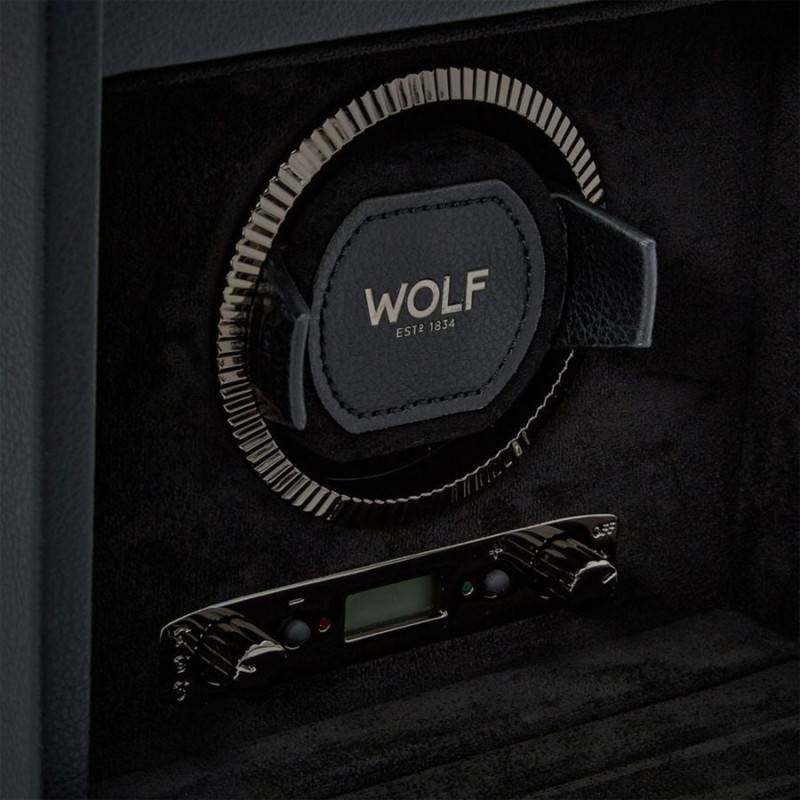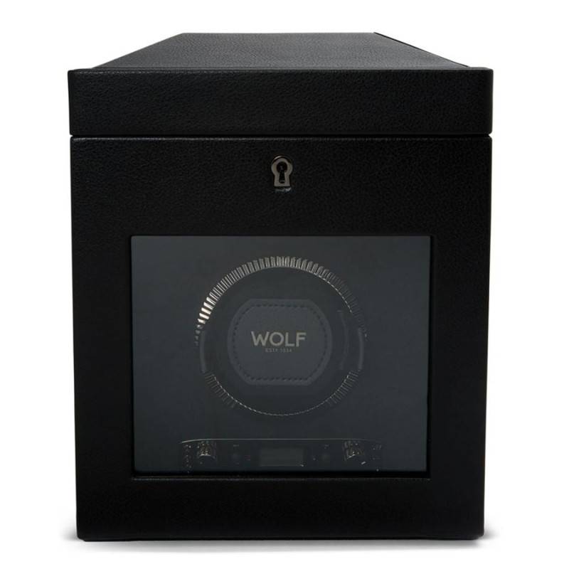 Le remontoir Wolf 1834 avec rangement incarne l'excellence et la sophistication dans l'univers des accessoires horlogers. Habillé d'une élégante matière végétale noire avec des finitions canon de fusil, ce modèle allie design contemporain et technologie de pointe. Son architecture à panneaux inclinés quadruples et sa lunette cannelée lui confèrent une allure résolument moderne et raffinée.