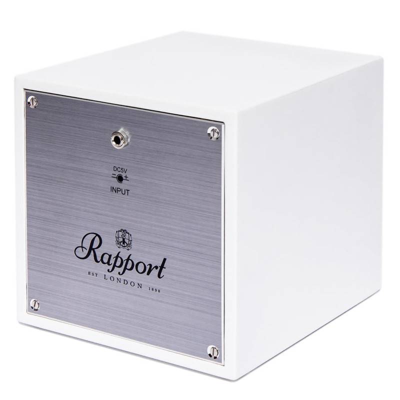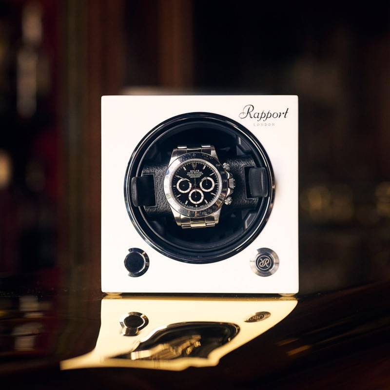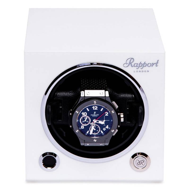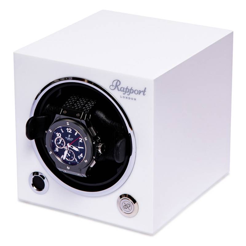 La maison Rapport London a le plaisir de vous présenter son remontoir à montre unique EVO41 issu de la collection MKIII Evolution. Élégant et raffiné, ce sublime remontoir blanc polaire conçu en bois est habillé de différentes couches de laque. Il renferme un coussin en cuir souple de couleur noire. Ce dernier accueillera votre garde-temps. Des petites montres classiques en passant par les plus grands modèles sportifs, ce remontoir de forme cube peut accueillir des pièces horlogères de grandes dimensions. Pour plus de sécurité, le coussin intérieur possède des clips réglables qui assurent le maintien de votre montre.