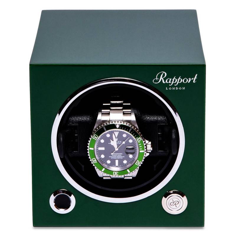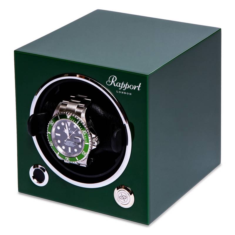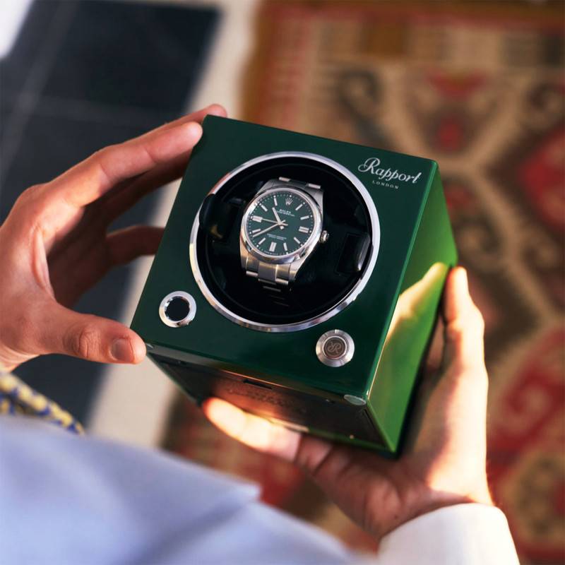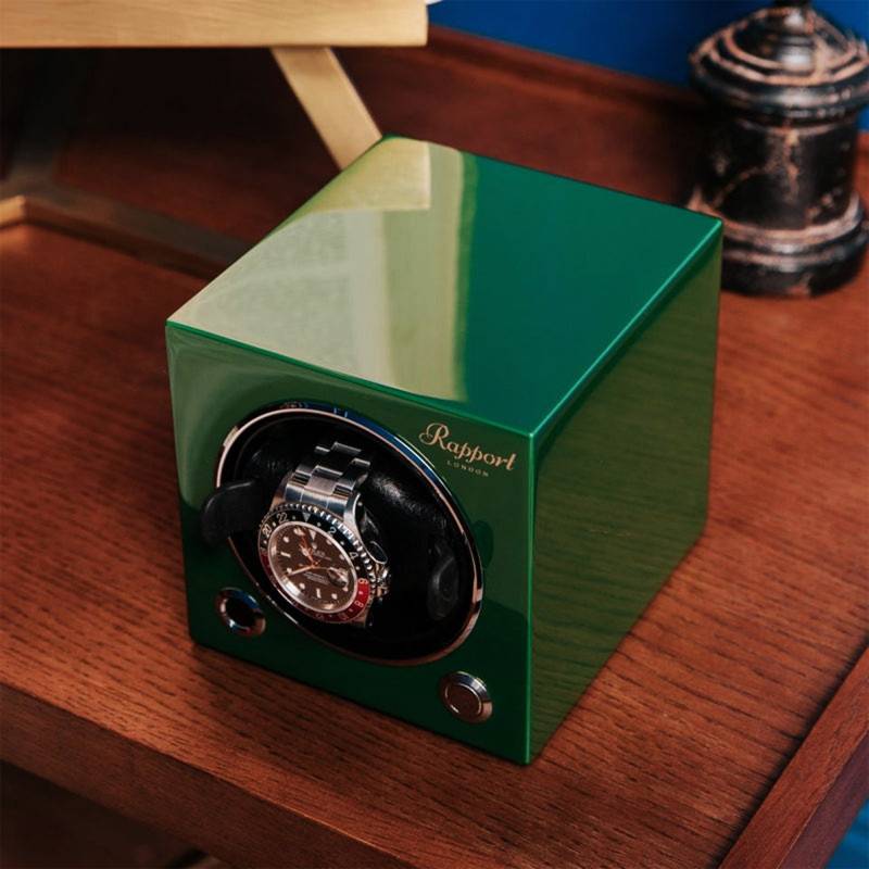 La maison Rapport London vous invite à découvrir son élégant remontoir à montre unique EVO44. D'une sublime couleur vert foncé, ce modèle fait partie de la collection Evolution MKIII. Fabriqué dans un bois de grande qualité, il est habillé de nombreuses couches de laque. De forme cube, il renferme un coussin en cuir de couleur noire. Équipé de clips réglables, vous pourrez y déposer votre montre en toute sécurité. Par ailleurs, son design peut accueillir des montres classiques comme de grands prestigieux garde-temps.