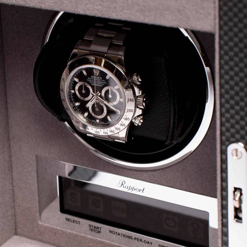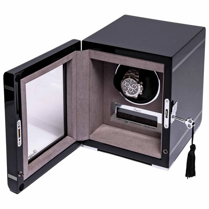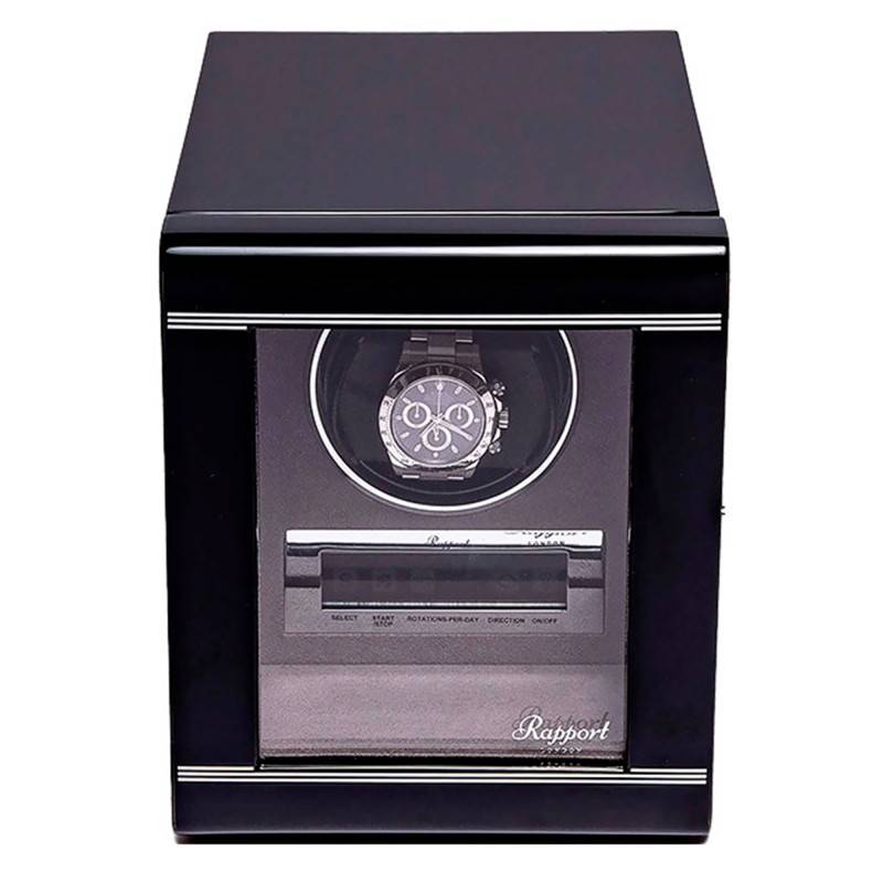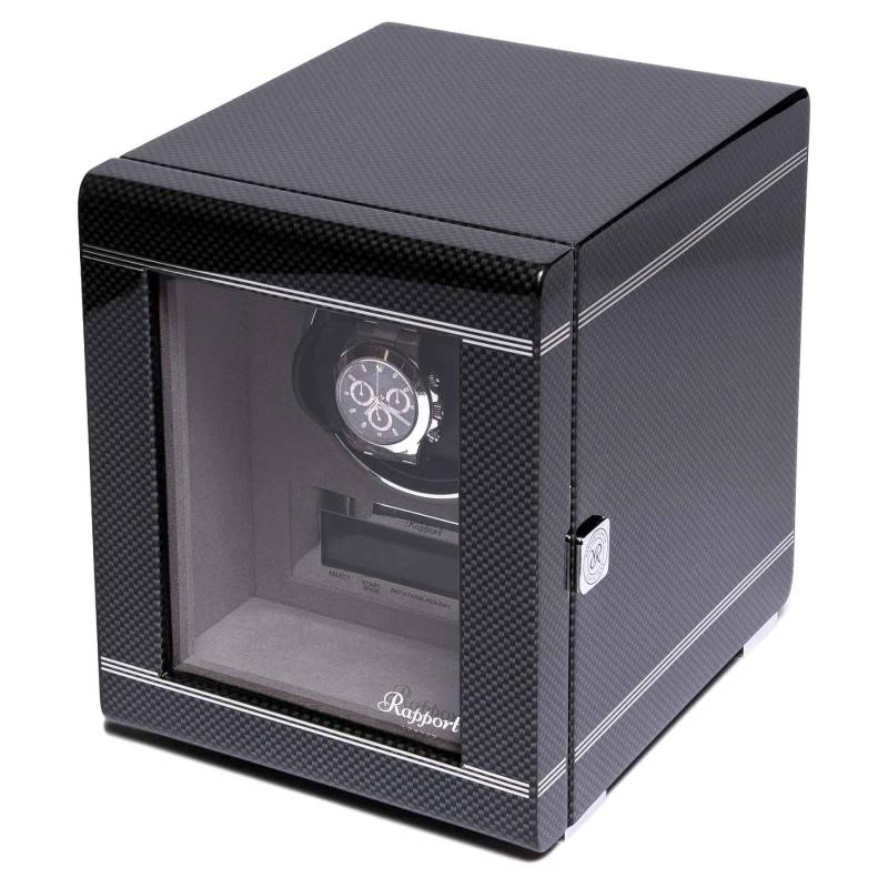 Le remontoir Formula Single Watch vous est présenté par la marque Rapport London. Il conservera votre montre automatique à l'heure même lorsque vous ne la portez pas. Ce remontoir de couleur noire dispose d'un intérieur en velours qui est éclairé pour mettre en valeur la pièce qu'il accueillera. La porte avant est verrouillable au moyen d'une clef et est vitrée pour pouvoir voir la montre que le remontoir contient. L'écran LCD tactile vous permettra de sélectionner les réglages qui vous conviennent le mieux.