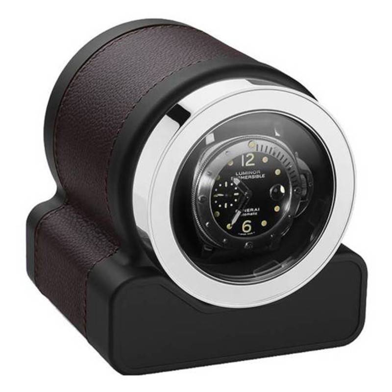 La maison Scatola del Tempo, à l'origine du remontoir à montres, propose aux adeptes des accessoires horlogers son modèle Rotor One Grey 03008.G. Ce dernier en forme de cylindre sur un socle carré possède les dimensions suivantes: 12 cm de hauteur, 10 cm de longueur et 10 cm de largeur. Élégant, il est conçu en cuir de vache de couleur grise extrêmement doux au toucher et pourvu de surpiqûres. Vous pourrez garder un œil sur votre montre à travers la petite fenêtre de forme ronde de ce remontoir gris et noir.