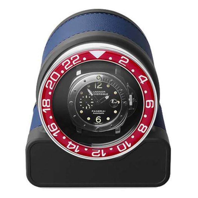 La maison italienne Scatola del Tempo vous propose des remontoirs pour montres. Cet objet permet à votre montre automatique de continuer de fonctionner en simulant les mouvements du poignet. Pour décrire un peu plus ce remontoir de montre, le Rotor one sport blue + red 03009.BL.R, sachez qu'il pèse 800 grammes et ses dimensions sont de 10 x 12 x 10 cm. Ce dernier se présente sous une forme cylindrique avec une base rectangulaire. Fabriqué en acier résistant, il est recouvert par une fine couche de cuir de vache. Vous pourrez admirer votre montre grâce à la glace de ce remontoir, qui est habillée d'une lunette graduée rouge et blanche.