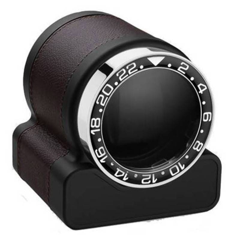 Les amateurs des accessoires horlogers apprécieront son design fonctionnel en forme de cylindre sur un boîtier rectangulaire. Avec ses 11.5 cm de hauteur, 10 cm de longueur et 10 cm d'épaisseur il est capable d'accueillir des plus petits aux plus gros diamètres de montre. Ses matériaux lui confèrent légèreté et raffinement avec son plastique ABS revêtu d'un cuir grainé italien de couleur "chocolat" et sa lunette chromée noire inspirée des grandes montres de plongée. Une fenêtre de forme ronde teintée de noir laissera entrevoir votre garde-temps.