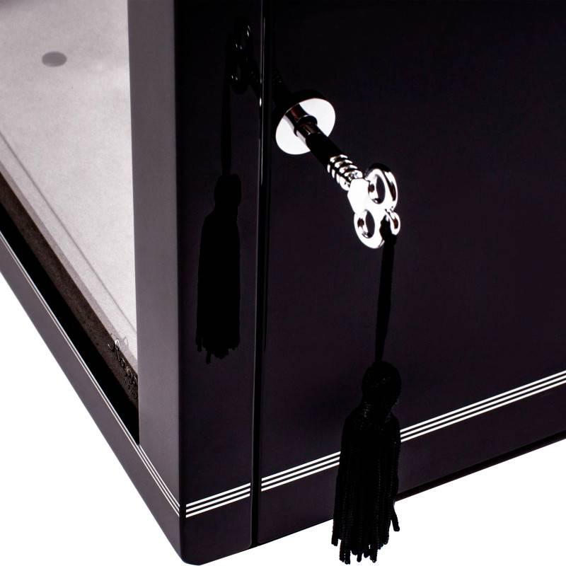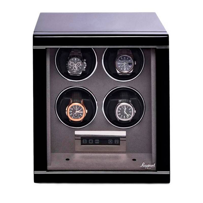 De couleur noire, ce modèle, conçu en bois d'ébène, est doté d'un boîtier verrouillable en verre avec clé qui affiche trois bandes distinctives sur sa face avant. Son intérieur est doublé de velours doux avec éclairage, raccords chromés et il est recouvert d'une laque appliquée à la main pour une finition ultra-moderne. De plus, il peut accueillir jusqu'à quatre montres automatiques, chacune avec son propre réglage qui peut être contrôlé via un écran LCD tactile. Il mesure 270 mm de longueur, 300 mm de hauteur pour une profondeur de 200 mm. Avec un porte-montre en cuir noir, ce remontoir de montre de luxe est adaptable à n'importe quelle taille de bracelet.