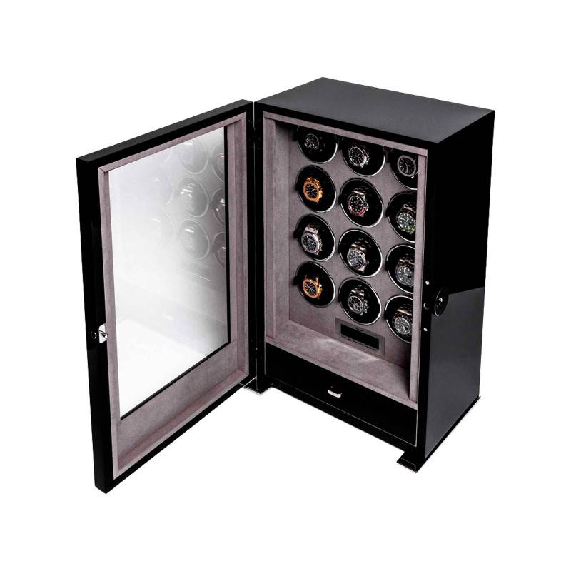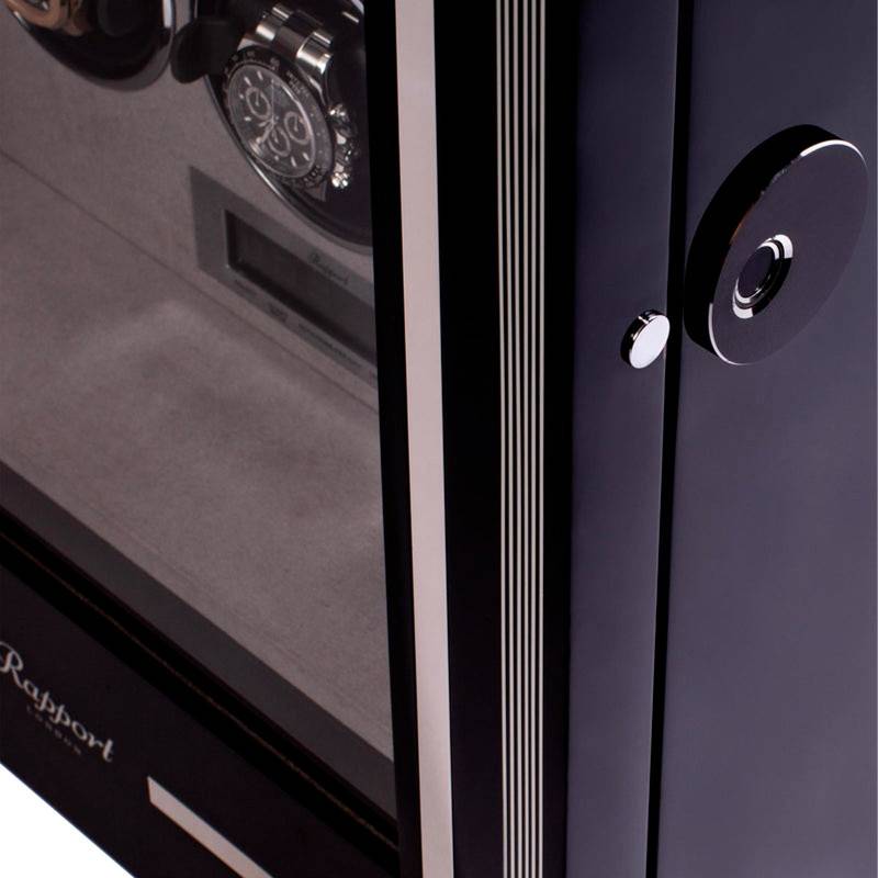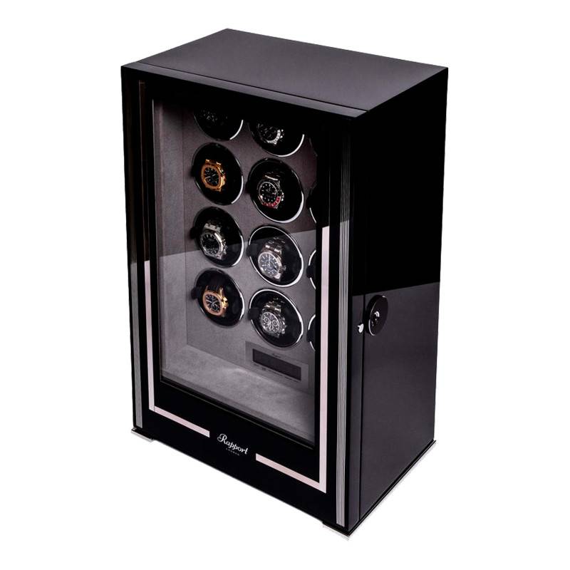 La marque Rapport London met en avant la qualité de construction de ses boîtes en bois qui ont des caractéristiques conçues pour imiter l'action d'une montre portée. Elle vous présente ce remontoir Paramount Twelve W212 de forme rectangulaire. Fait en cuir de bovin, il possède 12 coussins capables d'abriter 12 de vos montres automatiques dans une élégante armoire. Très grand, ce dernier possède une porte d'accès qui fonctionne avec empreintes digitales et s'ouvre sur un rétro-éclairage lisse en velours gris. Les paramètres de rotation des garde-temps une fois à l'intérieur peuvent être contrôlés au moyen d'un écran tactile LCD. Ce remontoir de couleur noire fait aussi office de décoration en plus d'entretenir vos horloges.
