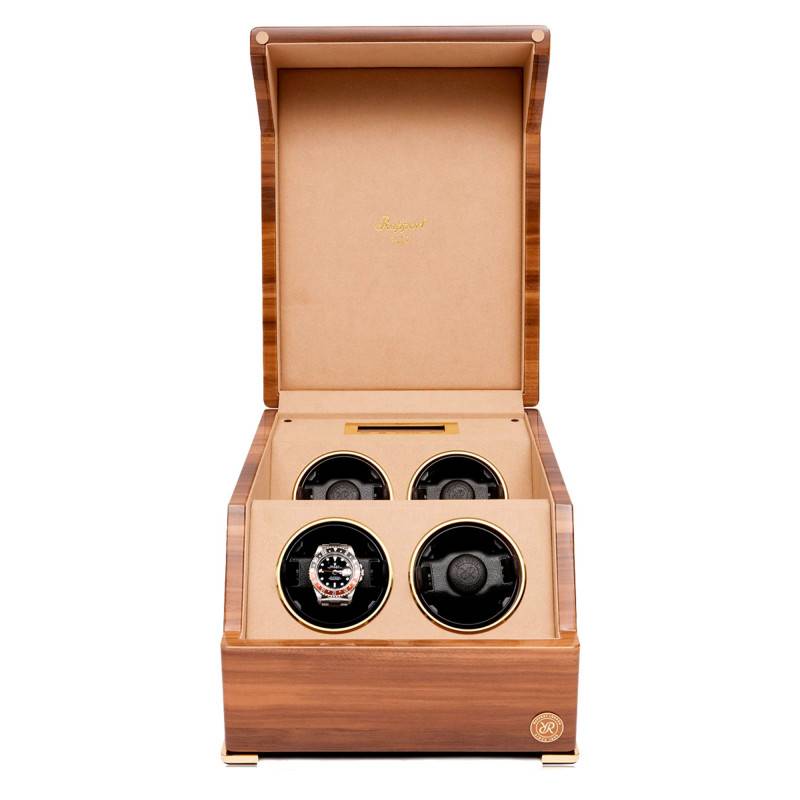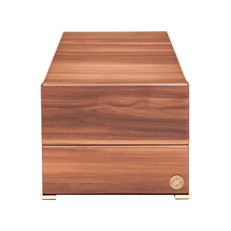 La marque Rapport London confectionne des produits horlogers allant des boites jusqu'aux remontoirs afin que vous puissiez garder vos fabuleuses montres en toute sérénité. Elle vous laisse admirer sa collection Perpetua III à travers le remontoir W584. Ce dernier se présente en forme rectangulaire avec un ravissant ton marron qui vire au beige. L'intérieur est doublé de velours avec 4 coussins de montre en cuir de bovin souple et réglages. Ils s'adaptent à la taille de votre choix et veilleront à ce que vos garde-temps se déplacent en douceur. Un panneau LDC est entouré d'un matériau en velours lisse et se fixe à l'arrière. Ce dernier permet de choisir les réglages du remontage tel que le nombre de rotations par jour, la vitesse du mouvement ainsi que le sens de rotations. Notez que ce remontoir, signé par la marque, dispose des mesures suivantes : largeur 270 x profondeur 320 x hauteur 200 millimètres.