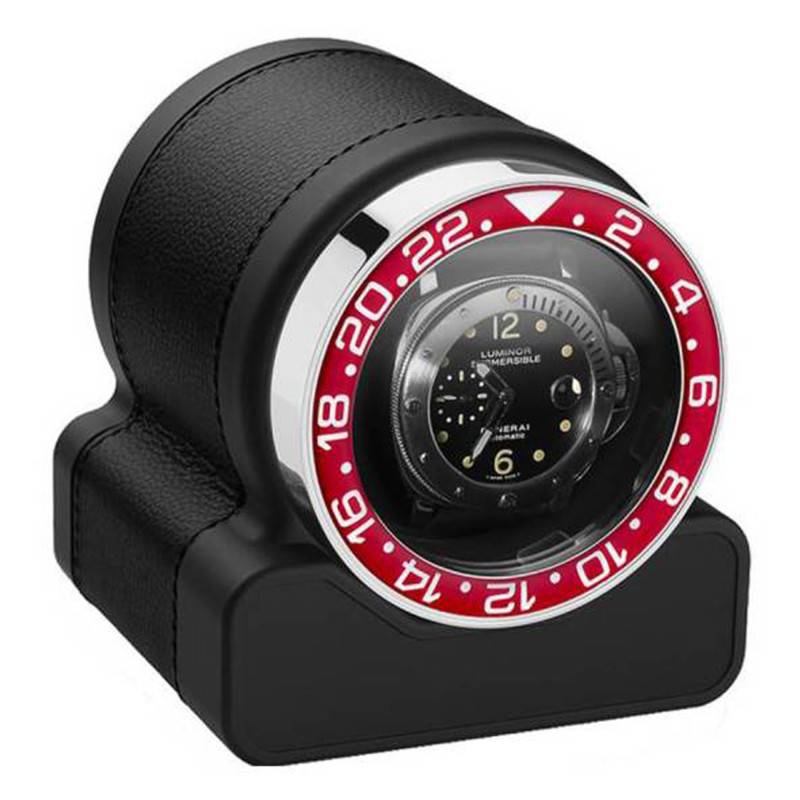 Ce rotor effectue 1800 tours par jour, dont la moitié dans le sens des aiguilles d'une montre, et l'autre moitié à l'inverse. Ce nombre correspond à la moyenne des montres automatiques disponibles aujourd'hui. Le moteur de ce remontoir est issu de la fabrique Swiss Kubik, garantissant des pièces locales et de qualité. Ce rotor s'anime grâce à deux piles alcalines classiques (1,5 volt) capables de durer environ 3 ans. Au dos de ce remontoir, un bouton marche/arrêt vous permet de mettre en route ou de stopper le mécanisme. La face visible de ce rotor est en cuir de veau grainé italien de couleur grise foncée. Une couche d'un matériau résistant aux chocs a été placée en-dessous. Au centre, une fenêtre transparente vous permet d'observer votre montre. Autour, une lunette chromée rouge comptant de deux en deux rappelle le style des montres de plongée. En termes pratique, notez que ce remontoir de montre pèse 800 grammes et que ses dimensions sont de 10 x 12 x 10 cm.