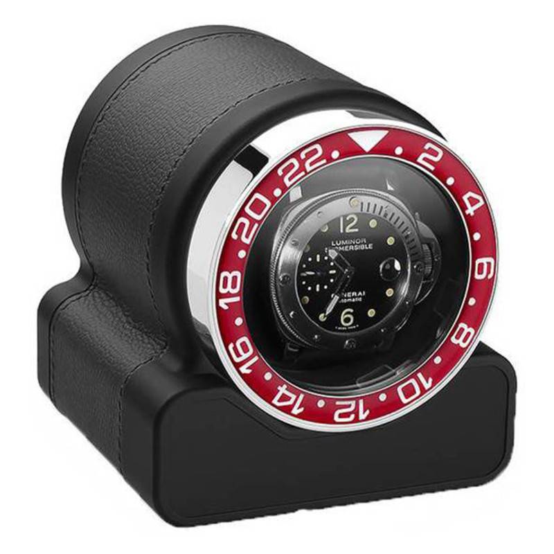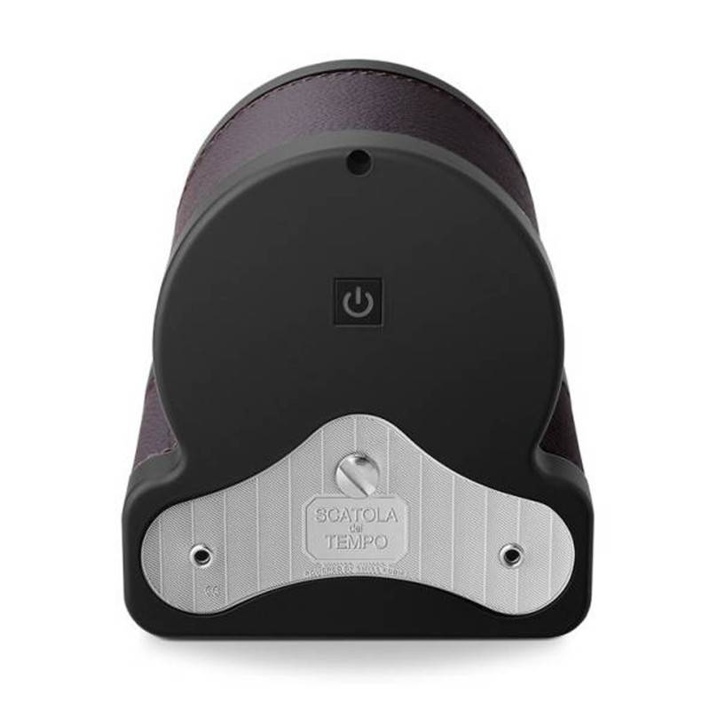 Ce rotor effectue 1800 rotations par jour, dont la moitié dans le sens des aiguilles d'une montre, et l'autre moitié à dans l'autre sens. Le moteur de ce remontoir est confectionné avec des pièces de la marque Swiss Kubik. Ce rotor s'anime grâce à deux piles alcalines classiques (1,5 volt) d'une durée de vie d'environ 3 ans. Au dos de ce remontoir, un bouton marche/arrêt vous permet d'actionner et d'éteindre le mécanisme. La face visible de ce rotor est en cuir de veau grainé italien de couleur marron chocolat. Une couche d'un matériau résistant aux chocs a été placée en-dessous. Au centre, une fenêtre transparente vous permet d'observer le cadran de votre montre. Autour, une lunette chromée de couleur rouge avec des chiffres arabes rappelle le design des montres de plongée. Pour finir, notez que ce remontoir de montre pèse 800 grammes et que ses dimensions sont de 10 x 12 x 10 cm.