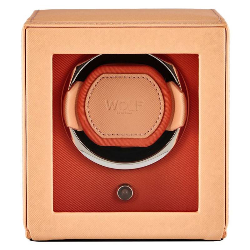 Le remontoir Cub avec couvercle de Wolf 1834 allie fonctionnalité et design audacieux avec son élégant coloris orange et pêche. Conçu en polyuréthane d'origine végétale (PU végétal), ce remontoir compact incarne l'engagement de la marque pour des matériaux durables et respectueux de l'environnement. Son extérieur arbore une belle teinte pêche avec des surpiqûres soignées, tandis que l'intérieur révèle un vibrant orange qui crée un contraste saisissant et moderne.