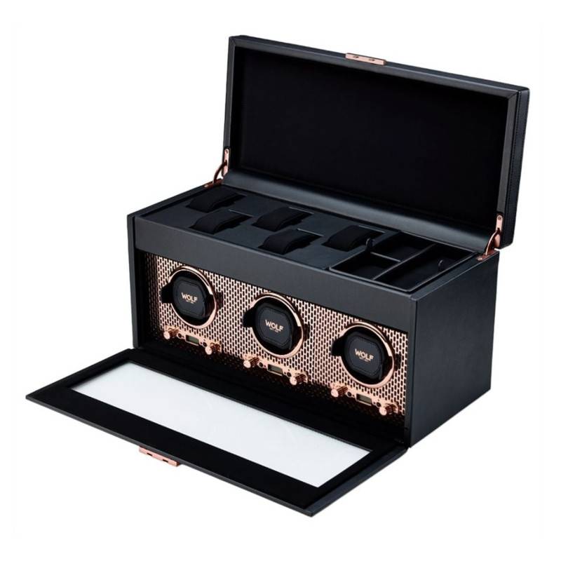 Doté de trois modules de remontage indépendants, ce modèle permet de prendre soin simultanément de plusieurs montres automatiques tout en offrant un espace de rangement supplémentaire grâce à ses deux compartiments dédiés. Chaque enrouleur intègre la technologie brevetée WOLF, garantissant un comptage exact des tours par jour pour un entretien optimal de vos garde-temps.