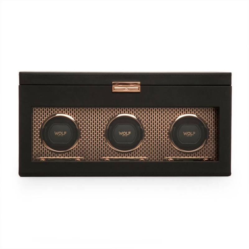Le remontoir triple signé WOLF 1834 s'impose comme une pièce d'exception pensée pour les collectionneurs avertis. Avec ses proportions généreuses (45,3 cm de long) et son design sophistiqué mêlant noir profond et finitions dorées, il allie élégance contemporaine et ingénierie horlogère de précision.