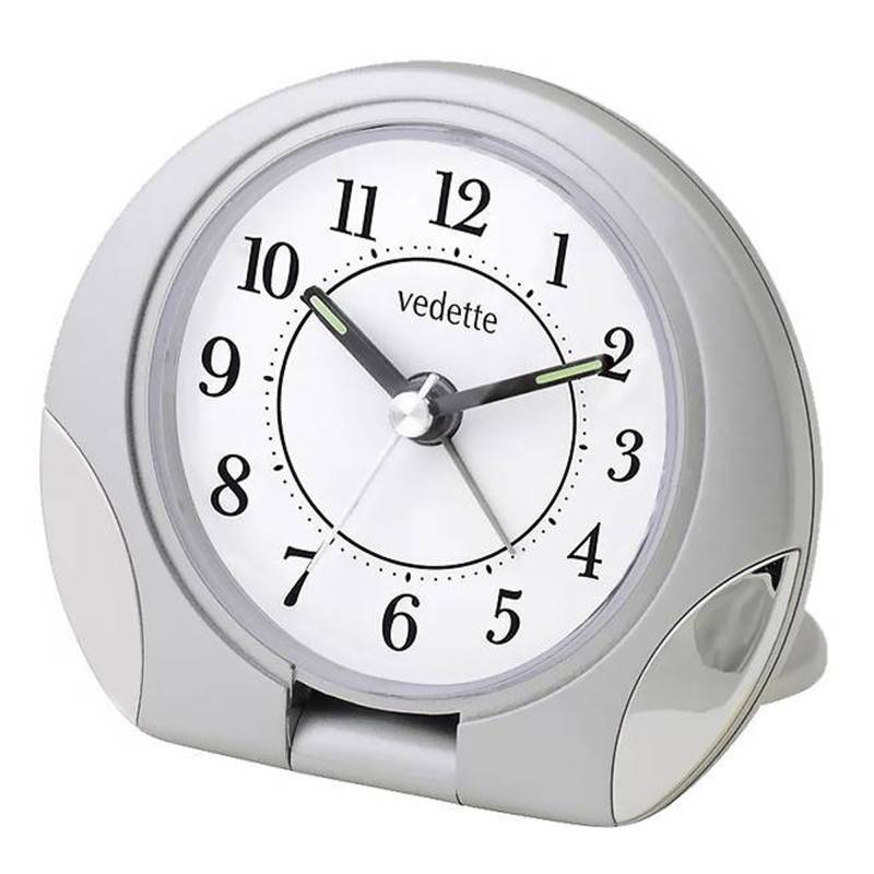 Depuis 1927, la marque française Vedette élabore des horloges, coucous, pendules, minuteurs et réveils avec un grand savoir-faire. Nous vous présentons aujourd'hui le réveil de voyage VR10088, pratique grâce à son format et à ses fonctions. En effet, ses dimensions sont de 8.1 x 7.2 x 2.3 cm soit un objet compact facile à emmener. Son boîtier argenté vous permet de le poser sur une surface plane. Le cadran est rond, doté d'un fond blanc. Des chiffres arabes noirs ponctuent les heures. Quatre aiguilles prennent place sur ce cadran dont les deux principales sont noires et luminescentes. Cet affichage analogique offre une lumière blanche éclairant le cadran.