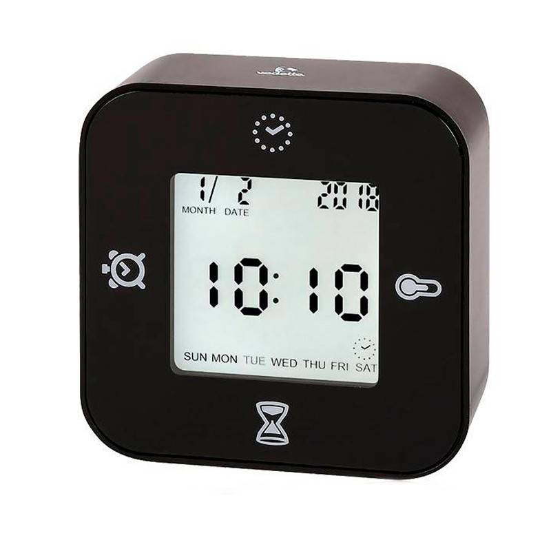 La marque française Vedette vous dévoile ce réveil quartz au look design et moderne. De forme carrée aux bords arrondis, il s'accordera à tous les intérieurs. Sa taille compacte, 7 x 7 x 3,5 cm, permet de le déplacer à votre guise. Disposant d'un boîtier noir avec 4 icônes de chaque côté du cadran, il vous étonnera par ses fonctions multiples. Son affichage numérique indique l'heure au centre de l'écran, la date et l'année en haut de l'écran, tandis qu'en bas se situent les jours de la semaine. Une icône est également présente sur l'écran en bas à droite, indiquant si une alarme est activée. Ce réveil est équipé d'un éclairage avec 3 couleurs.
