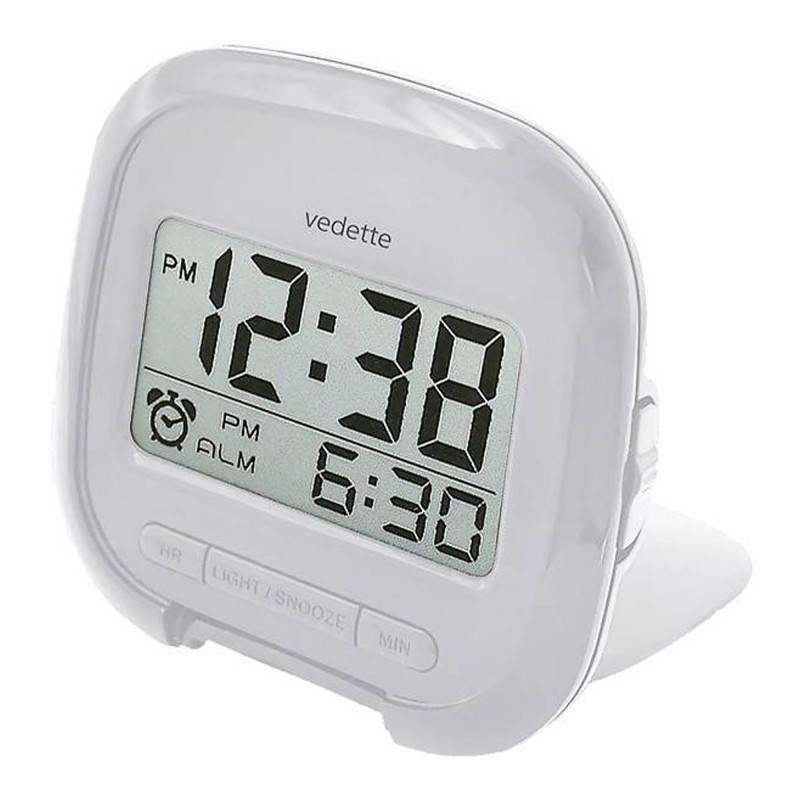 La marque horlogère Vedette vous dévoile son nouveau modèle de réveil de voyage. Solide et petit, il sera votre compagnon de voyage idéal. Il indiquera vos repères temporels avec précision, afin d'avoir un temps d'avance sur vos aventures. Il se compose d'un boîtier en plastique argenté, de forme carrée. Il mesure 4,9 cm de hauteur, 4,1 cm de largeur, et 2,6 cm de profondeur, et se glissera facilement dans tous vos sacs de voyage. Il vous offrira un affichage numérique de qualité grâce à son écran LCD. La marque française signe son nom sur la partie haute du boîtier.