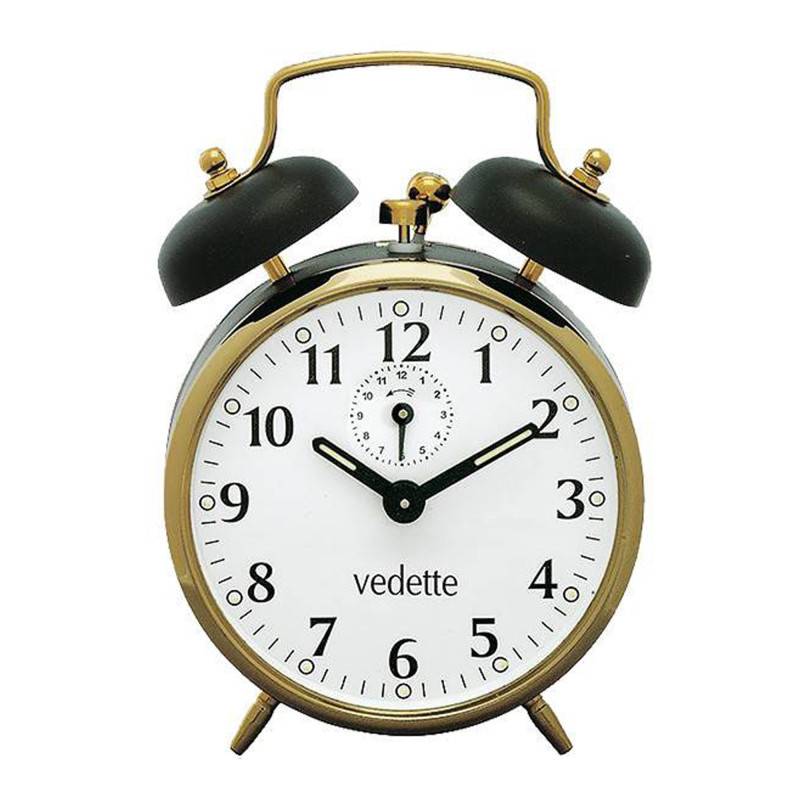 La marque Vedette vous dévoile sa collection de réveil mécanique à travers son modèle VR70006. Il est doté d'un boîtier rond en métal doré de dimensions 9.5 x 14 x 7 cm. Sur le dessus vous trouverez un petit bouton poussoir permettant de gérer la fonction alarme. De plus, vous trouverez un affichage analogique représenté par deux aiguilles noires luminescentes qui parcourent les heures, les minutes et les secondes représentées par des chiffres arabes, des index ronds et un chemin de fer. Sous l'index de 12 heures, vous trouverez un chemin de fer des secondes parcouru par une fine aiguille. Classique et vintage, ce réveil vous séduira et se mariera parfaitement avec votre décoration d'intérieur. Enfin, la marque signe cette création au-dessus de 6 heures.