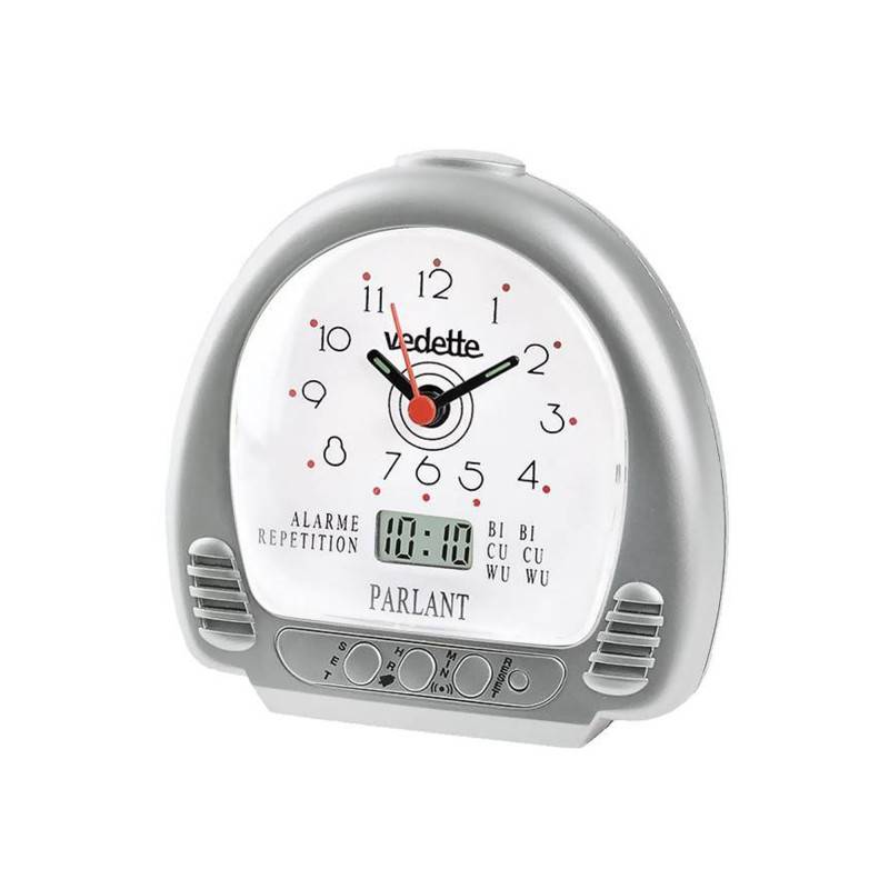 Découvrez le nouveau réveil parlant proposé par la marque française Vedette. Vous ne louperez plus le réveil grâce à ce dernier. Il s'accordera facilement à votre intérieur grâce à sa petite taille et son design classique et épuré. Son boîtier gris est en forme de demi-lune. Il mesure 11 cm de hauteur, 10,8 cm de largeur pour 5,3 cm de profondeur. Le cadran blanc accueille à la fois un affichage analogique et numérique, pour davantage de précision. Pour l'affichage analogique, les index des heures sont représentés par des chiffres arabes, et les aiguilles indiquent les heures, les minutes et les secondes.