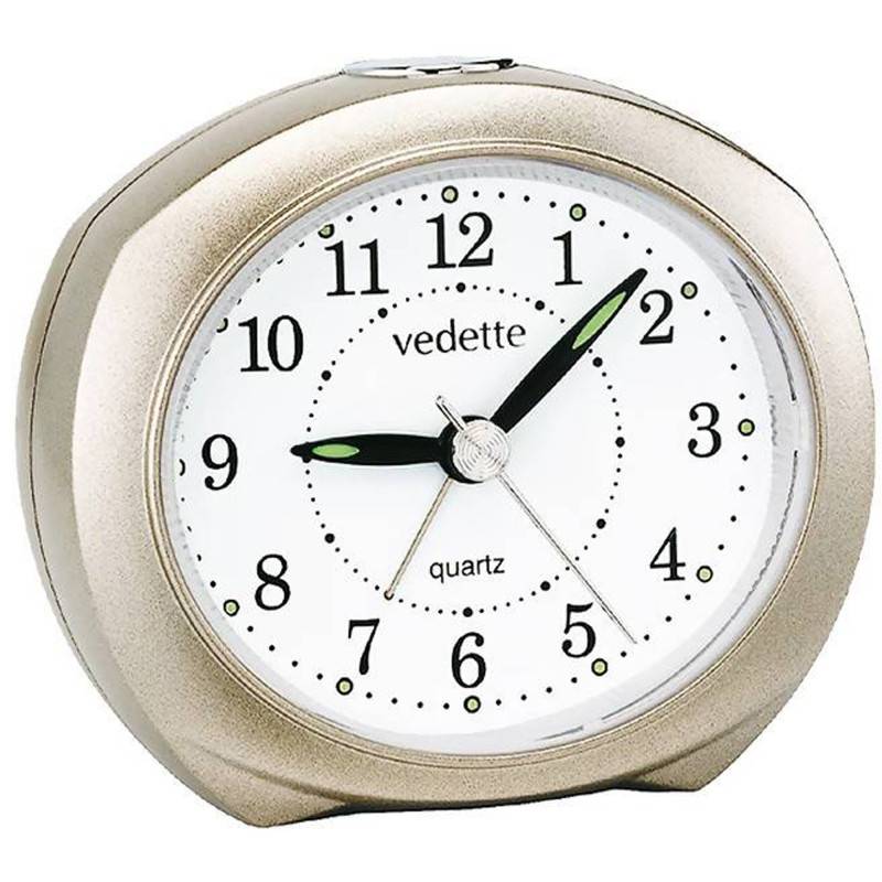 La maison horlogère Vedette vous dévoile son ravissant réveil Quartz 204.1050.07. De couleur champagne, il est de dimensions 8,7 x 7,7 x 3,7 cm. Il se compose de deux aiguilles indiquant les heures et les minutes et d'une fine trotteuse indiquant les secondes. Elles parcourent les marqueurs du temps représentés par des chiffres arabes et un chemin de fer. De plus, les aiguilles et les index des heures sont recouverts d'une matière luminescente afin de lire l'heure même la nuit. Aussi, vous trouverez un petit chemin de fer des secondes au centre parcouru par une petite trotteuse. Vous pourrez régler la fonction alarme grâce au bouton situé sur le haut du cadran. Celui-ci est surmonté d'un verre qui le protègera contre les chocs et les rayures. Enfin, la maison signe ce modèle sous l'index de 12 heures.