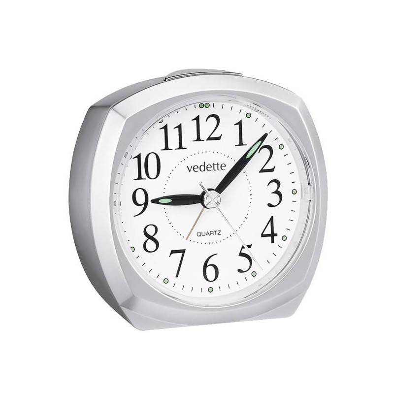 La marque Vedette vous dévoile sa collection de réveil Quartz à trotteuse silencieuse à travers son modèle 204.1063.05. Il est doté d'un boîtier rond gris métallisé de dimensions 8 x 8,3 x 3,9 cm. Sur le dessus vous trouverez un bouton poussoir permettant de gérer la fonction alarme. Aussi, vous trouverez un affichage analogique représenté par des aiguilles et une trotteuse qui parcourent les heures, les minutes et les secondes représentées par des chiffres arabes et des index ronds. Ils sont complétés par un chemin de fer des secondes au centre. De plus, les aiguilles et les index des heures sont recouverts d'une matière luminescente afin de pouvoir lire l'heure même la nuit. Pour protéger le tout contre les chocs et les rayures le cadran est surmonté d'un verre. Enfin, la marque signe cette création à midi.