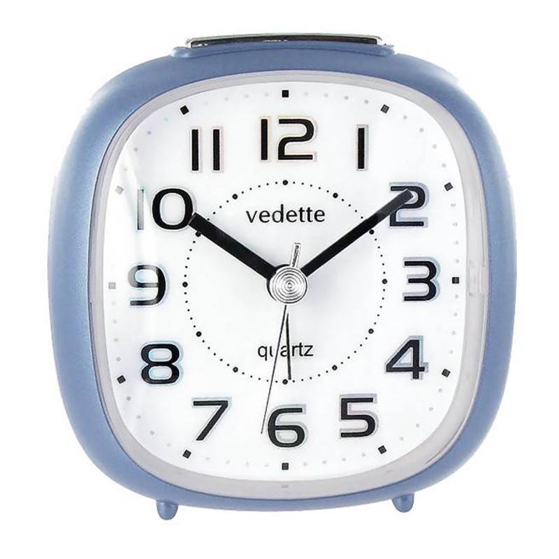 La marque Vedette vous dévoile son modèle de réveil Quartz à trotteuse silencieuse VR10037. Il est doté d'un boîtier de forme carré et de dimensions 8,4 x 9,6 x 4,2 cm. Sa couleur bleue met parfaitement en valeur le cadran blanc. En son centre, s'animent deux aiguilles bâtons noires et une fine trotteuse qui parcourent les heures, les minutes et les secondes. Ces marqueurs du temps, sont représentés par des chiffres arabes et des index ronds et carrés. De plus, ils sont complétés par un chemin de fer des secondes au centre. Le tout est protégé par un verre contre les chocs et les rayures. Enfin, vous trouverez la signature de la marque à midi.