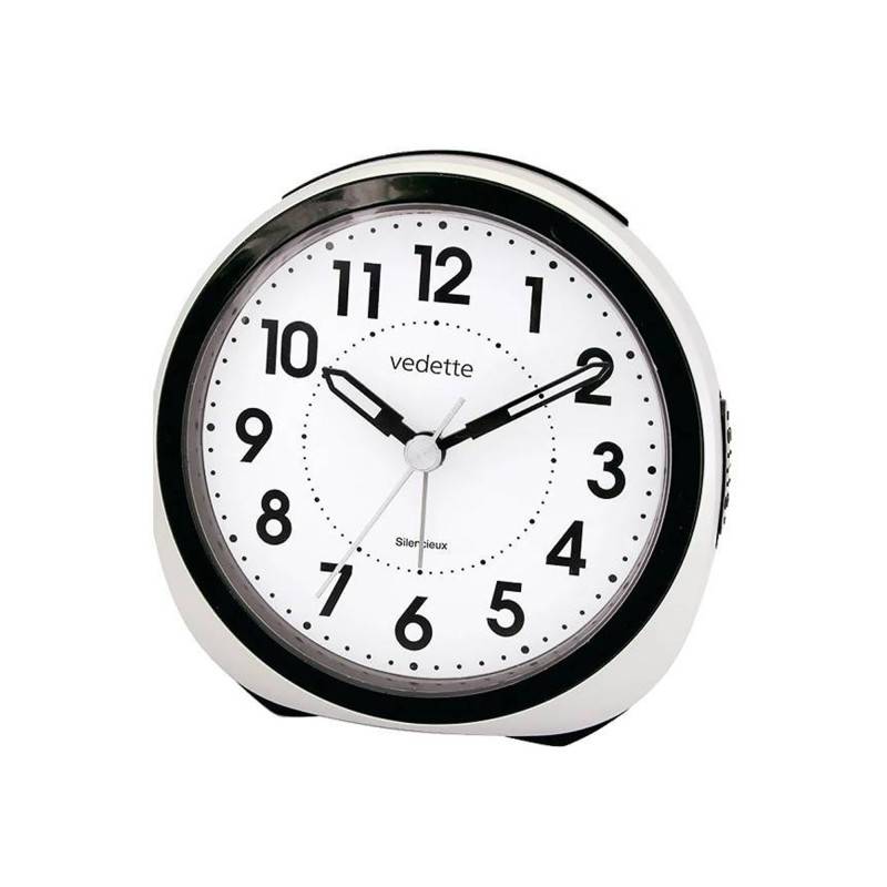 La marque horlogère Vedette est depuis 1927, la marque française incontournable des réveils. Elle vous propose de découvrir le modèle VR10103 de la collection réveil quartz à trotteuse silencieuse. Ce réveil présente un boîtier de forme ronde en plastique. Il est de couleur blanc et noir, de quoi se marier à tous vos élément de décoration avec facilité. Il mesure 10.1 * 10.1 * 5.4 cm et se posera facilement, partout où vous le souhaitez. Par ailleurs, ce réveil vous offrira un affichage analogique de qualité. Vous remarquerez la signature de la marque en-dessous de l'index des douze heures.