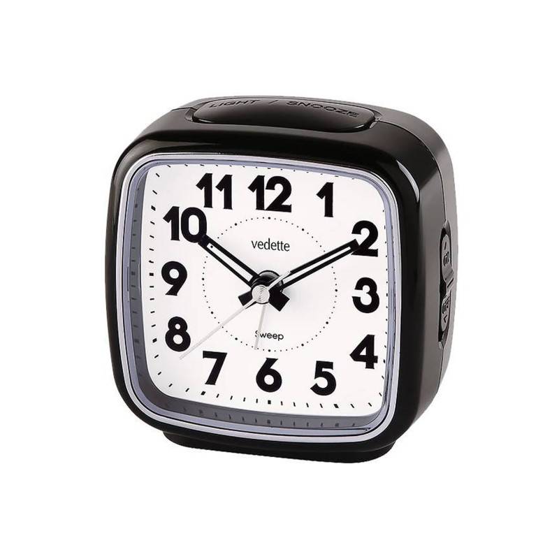 La marque Vedette vous propose de découvrir son réveil à mouvement Quartz VR10112. Il est de forme carré et est doté d'un boîtier noir de 8 x 8,3 x 5,1 cm. Sur le dessus vous trouverez un bouton poussoir et un autre bouton sur le côté afin de gérer l'alarme. Au centre, s'animent deux aiguilles squelettes noires qui parcourent les heures et les minutes et une trotteuse grise qui désigne les secondes. Elles parcourent les marqueurs du temps représentés par des chiffres arabes et un chemin de fer. De plus, au centre un chemin de fer des secondes vient compléter le tout parcouru par une petite trotteuse. Le tout est protégé contre les chocs et les rayures par un verre. Enfin, vous trouverez la signature de la marque à midi.