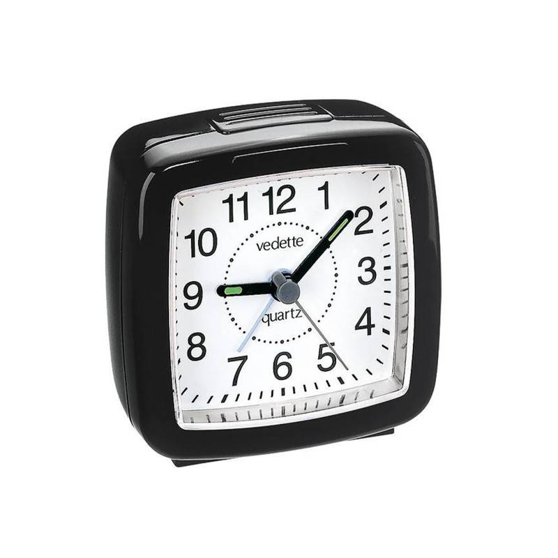 La marque française Vedette vous présente le modèle 204.1000.05. Disposant d'un mouvement quartz, il dispose de dimensions très pratiques : 7 x 7 x 3,4 cm. Sa forme carrée rend son environnement variable car il s'adapte à toutes les pièces ou endroits où vous l'emmènerez. Un bouton noir est situé sur le dessus du cadran, permettant l'utilisation de la fonction répétition de l'alarme. Ses trois aiguilles noires sont placées au centre, disposant pour les aiguilles des heures et des minutes d'un bout luminescent ; pratique pour se repérer dans l'obscurité. Un chemin de fer des minutes et des secondes parcourent le cadran, venant indiquer plus précisément les secondes ; des chiffres arabes remplacent les index bâtons pour les heures. Une partie noire au dessus du cadran permet un éclairage du cadran par une lumière blanche. Une vitre en verre permet la protection du cadran de ce réveil. Enfin, vous trouverez la mention "Vedette" sous l'index de douze heures.