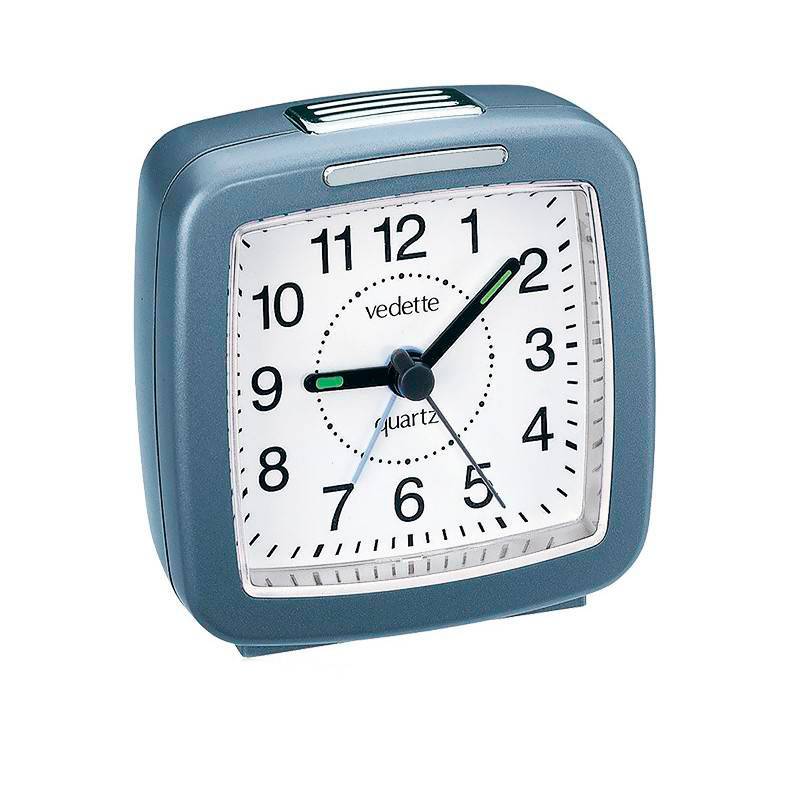 La marque horlogère Vedette vous dévoile le réveil à mouvement quartz 204.1000.09. Doté d'une forme carrée, il dispose d'un boîtier bleu ciel aux dimensions suivantes : 7 x 7 x 3,4 cm. Au-dessus, le bouton gris poussoir permet d'arrêter le réveil lorsqu'il sonne. Un chemin de fer des minutes ainsi les heures sous forme de chiffres arabes sont apposés sur le cadran. 3 aiguilles noires parcourent le cadran, les heures et minutes sont dotées d'une partie luminescente, pour un meilleur éclairage dans l'obscurité. Un témoin blanc situé juste au-dessus du cadran s'éclaire et permet une vision nocturne du cadran. Le cadran est protégé par une vitre en verre ; la signature "vedette" est apposée au centre sous l'index de 12 heures.