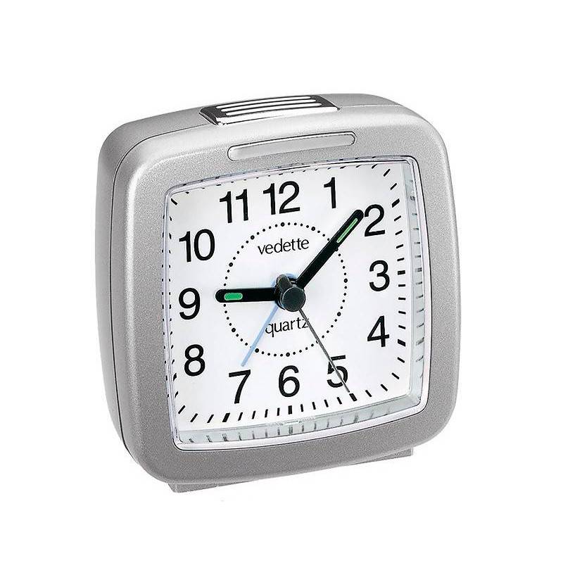 La marque Vedette, pionnière des réveils français, vous présente le modèle 204.1000.11, classique de la marque. Possédant un verre protégeant le cadran, ce réveil dispose d'une forme carrée. Son affichage analogique de qualité s'effectue grâce à ses 3 aiguilles placées en son centre. Les aiguilles noires des heures et des minutes ont un bout luminescent, pour lire l'heure dans l'obscurité, tandis que la trotteuse, de couleur grise, est plus fine. Au-dessus du cadran, sur le boîtier, se situe un bouton poussoir gris, permettant la répétition de l'alarme. Un chemin de fer des minutes parcourt tout le tour du cadran, tandis qu'un chemin de fer des heures est plus proche du centre, et d'une forme ronde. Les heures sont indiquées par douze chiffres arabes, une lumière est également présente pour une meilleure lecture horaire nocturne. La signature de la marque est située sous l'index de midi.