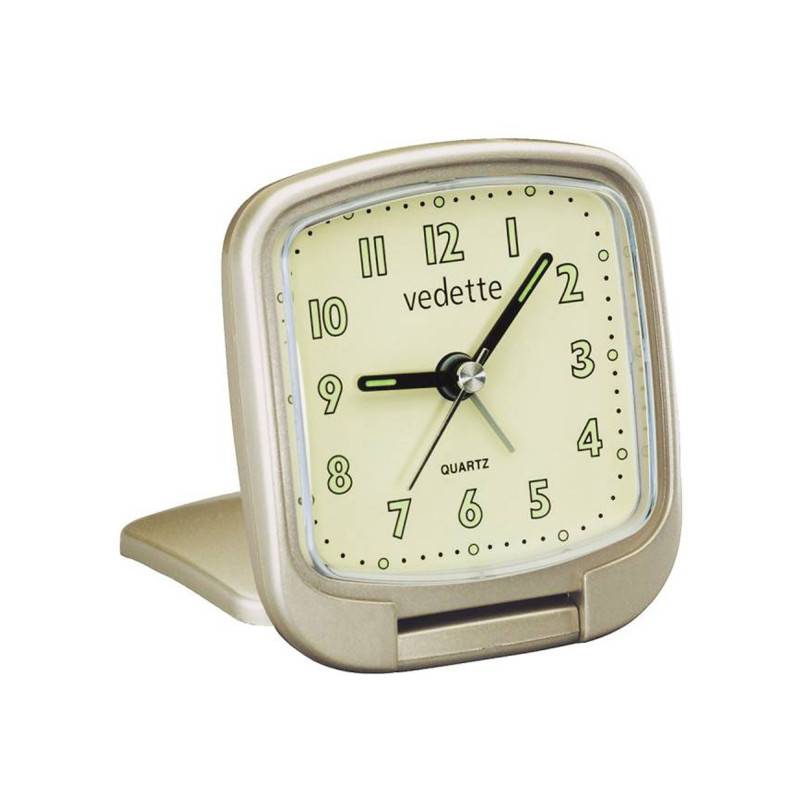 Optez pour un modèle portable facilement grâce à ce Réveil quartz de voyage 204.1014.07 de la marque Vedette. Sa couleur champagne ne manquera pas de vous séduire, et ses dimensions seront très pratiques au quotidien ! De forme carrée, il s'équipe d'un socle pliable qui vous permettra de le poser n'importe où et de le ranger dans vos affaires facilement. Un cadran carré de couleur beige vient vous indiquer le temps via un affichage analogique incarné par quatre aiguilles centrales. Elles vous indiquent les heures, les minutes, les secondes et l'alarme. Elles parcourent des chiffres arabes verts aux bords noirs qui vous indiquent les heures sur un format 12h. Pour plus de précision, un chemin de fer des minutes vient s placer sur le pourtour du cadran. Notez que les aiguilles des heures et des minutes disposent d'un revêtement luminescent qui vous permettra de les remarquer dans les milieux sombres comme la nuit. Enfin, la maison signe son modèle avec son nom qu'elle place en dessous de midi.
