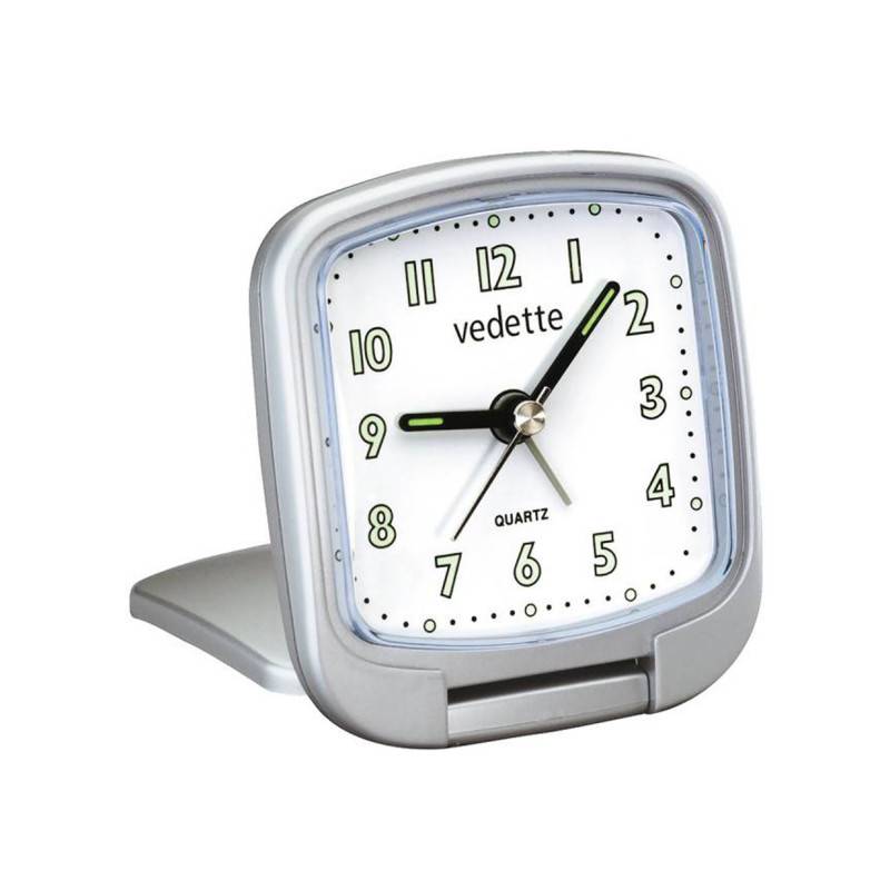Vedette vous propose de découvrir ce Réveil quartz de voyage 204.1014.11 qui vous accompagnera partout ! De forme carrée, il vous propose un style argenté métallisé. Il s'équipe d'un socle pliable qui vous permettra de la poser où vous le souhaitez, mais aussi de le ranger facilement dans vos affaires sans vous encombrer. En son centre, un cadran de la même forme vient se placer. Il affiche un fond blanc qui dispose un affichage analogique. Quatre aiguilles prennent place au centre pour vous indiquer les heures, les minutes, les secondes et le réglage de l'alarme. Elles disposent d'un revêtement luminescent qui vous permettra de les lire dans les milieux obscurs. Elles parcourent des chiffres arabes verts aux bords noirs qui incarnent les heures de 1 à 12. Juste derrière, au niveau du pourtour du cadran, un chemin de fer des minutes vient se placer pour vous offrir plus de précision dans votre lecture du temps. Enfin, la maison vient signer son modèle avec son nom qu'elle appose en dessous de l'index sue 12 heures.