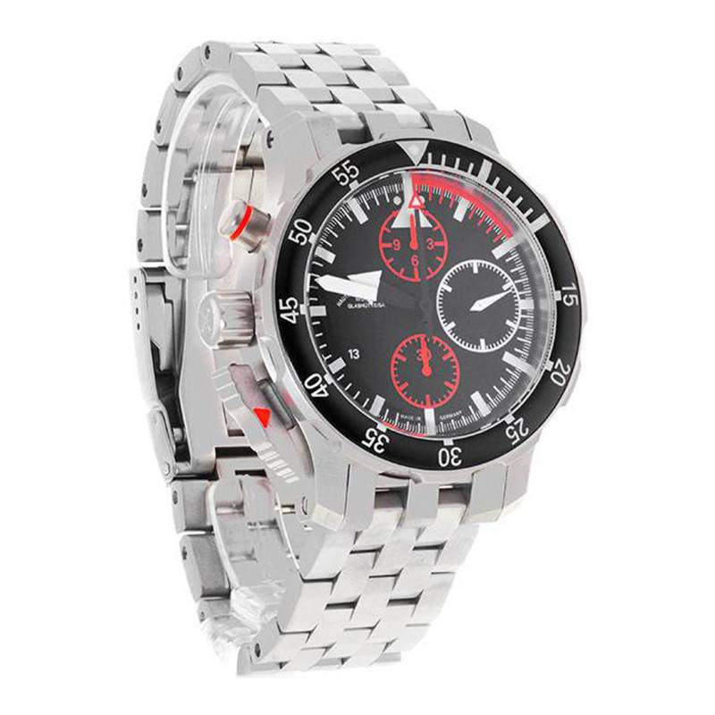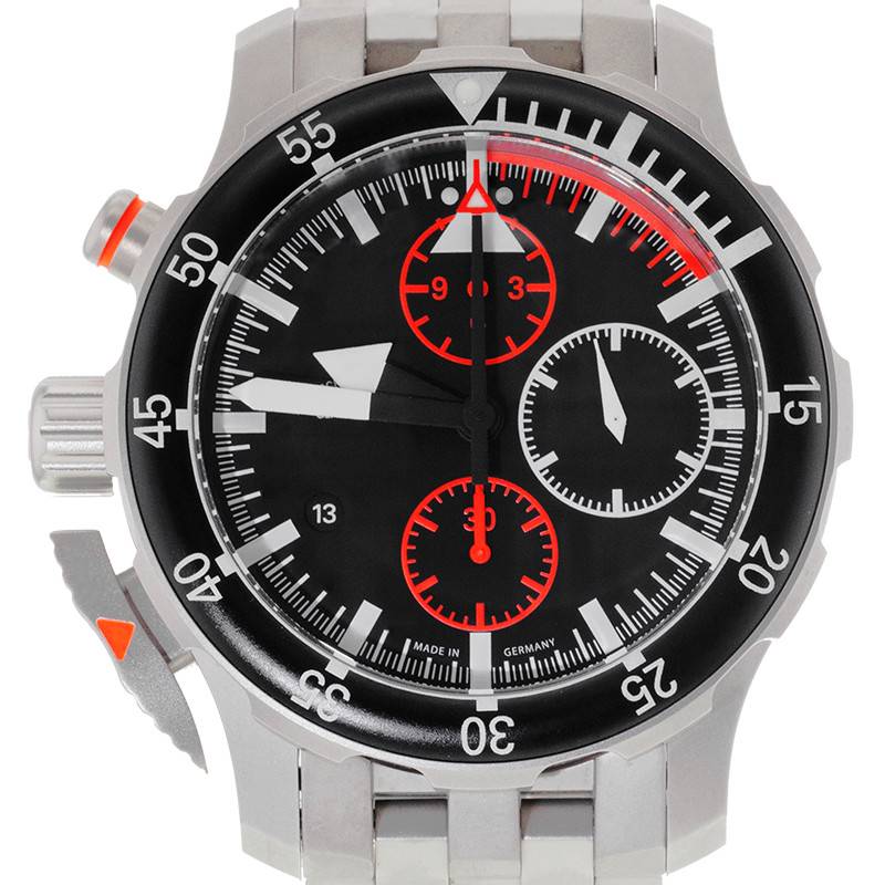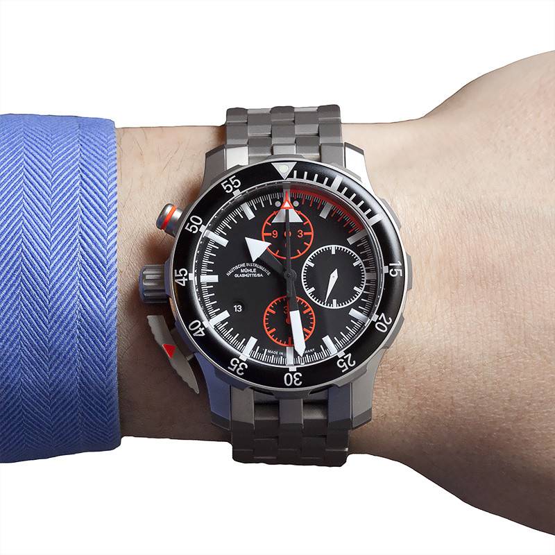 Le Mouvement Cette montre abrite un mouvement à remontage automatique Muhle 9408, basé sur le célèbre mouvement suisse ETA Valjoux 7750. Ce calibre de 25 rubis indique heures et minutes, les secondes dans un compteur petite seconde dédié à 3h et la date dans un guichet à 8h. Il est équipé du dispositif Stop Seconde qui permet un réglage de l'heure à la seconde près. Il dispose de la fonction chronographe avec un compteur 30mn et un compteur 12h. Ce mouvement a une fréquence de 28.800 A/h, pour une réserve de marche de 48 heures.
