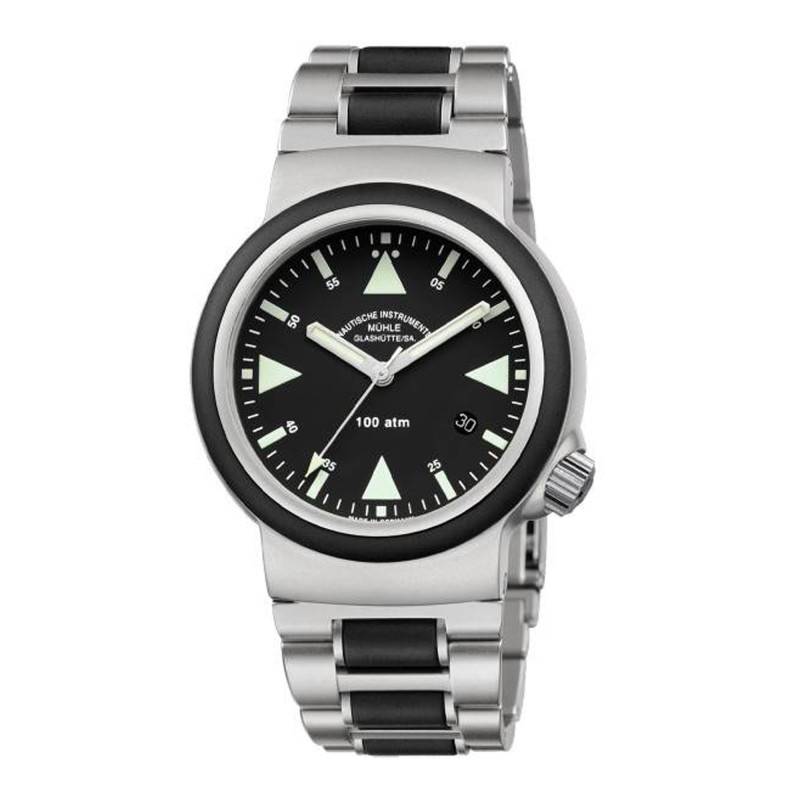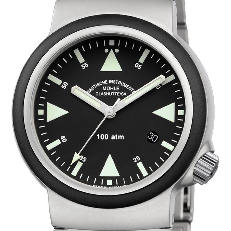 La marque allemande Mühle présente ce modèle S.A.R Rescue-Timer. Ce garde-temps parfait pour la plongée dans les eaux profondes sera un atout non négligeable. La lecture de l'heure sera également possible grâce à une forte luminescence en milieu obscur. Idéal pour un poignet d'homme, le boitier en acier inoxydable dispose d'un diamètre de 42mm et une épaisseur de 13.50mm. C'est un verre saphir, de 4mm d'épaisseur, qui vient en protection du cadran. Une lunette de couleur noire en caoutchouc vient trancher avec la couleur grise du boitier. En ce qui concerne le fond de boite, il est vissé. De façon peu habituelle, la couronne se situe à 4h.
