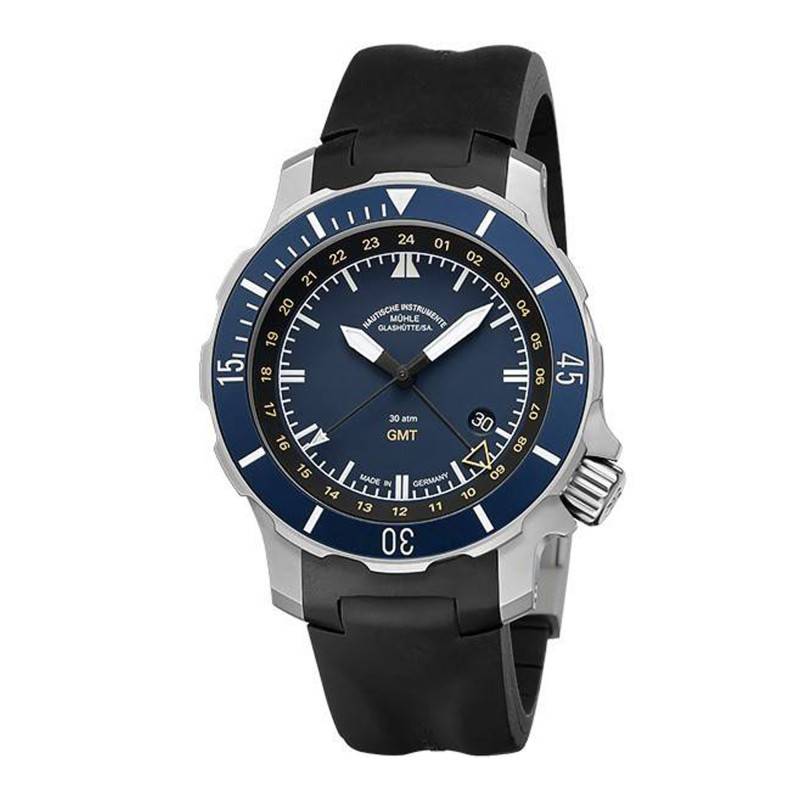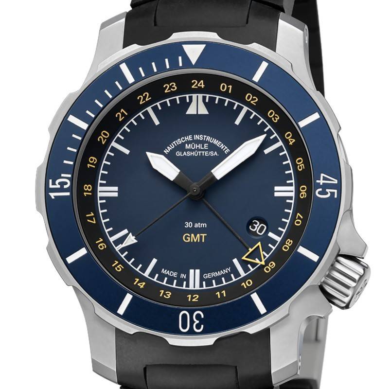 Voici le modèle Seebataillon présenté par la maison allemande Mühle. Cette montre saura vous accompagner durant toutes vos expéditions aquatiques. De couleur bleue, elle met vraiment en avant les profondeurs et la découverte des fonds marins. Ce garde-temps vous donne aussi la possibilité d'avoir un second fuseau horaire. Le boitier, en titane, dispose d'un diamètre de 45mm et d'une épaisseur de 12.70mm. Un verre saphir bombé qui vient surplomber le boitier. La lunette est bi-directionnelle, avec des index gravés de couleur blanche. Le fond de boite est vissé et transparent ce qui vous permet d'admirer le mouvement automatique. Une couronne vissée se place à 3h.