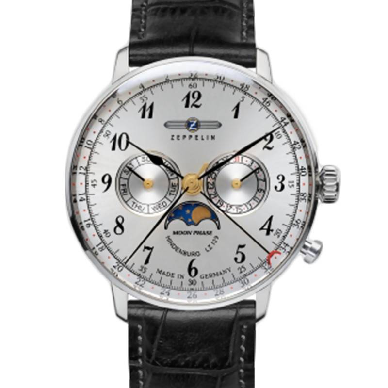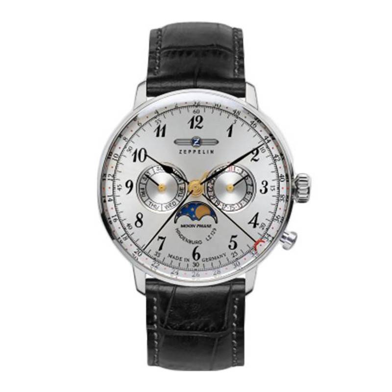 Montre homme de type aviation de la maison Zeppelin, ce modèle LZ129 Hindenburg 7036-1 embarque un mouvement à quartz suisse Ronda 706B contenant 5 rubis. La montre offre les fonctions heures, minutes, secondes, date, jour, phase de lune et numéro de la semaine. Le boitier de forme ronde (40 mm de diamètre pour une épaisseur de 10mm) est en acier inoxydable poli surmonté d'un verre hésalite. Le fond est emboité. Couronne à 3h et bouton poussoir à 4h pour un réglage rapide de la date (manipulation impossible entre 23h30 et 5h30). Bouton poussoir à 2h pour un réglage rapide de la semaine (impossible entre le samedi 23h30 et le mardi 00h45 en raison de l'activation du processus automatique des changements).