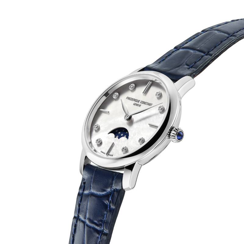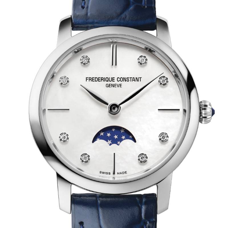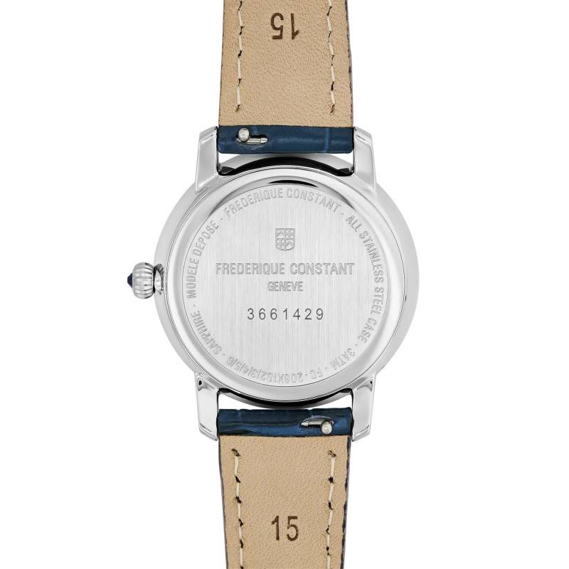 C'est un mouvement analogique à quartz de fabrication suisse qui se loge au sein de ce garde-temps. Ce calibre FC-206 de 5 rubis conçu par la maison Frédérique Constant vous offre les fonctions heures, minutes ainsi que phase de lune. La pile propose une durée de vie de 60 mois.