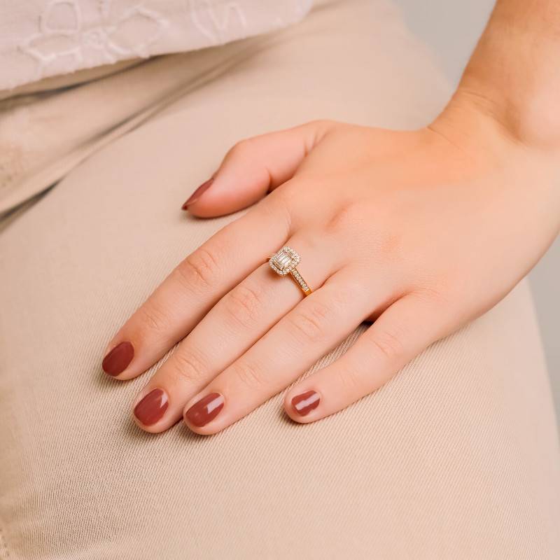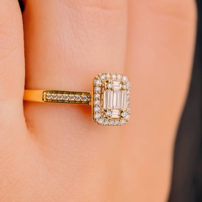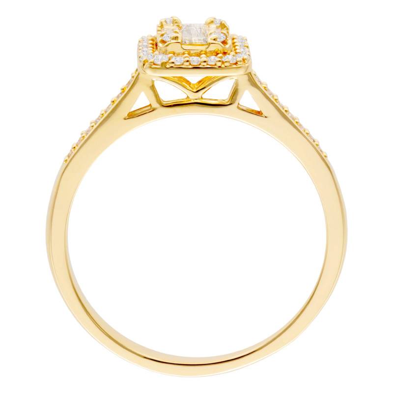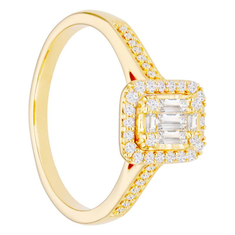 Ce prestigieux solitaire arbore une couleur dorée qui magnifiera votre doigt de façon éclatante. Parfait pour des fiançailles, il peut également faire l'objet d'un bijou raffiné à porter pour les occasions spéciales. Sa splendeur est rehaussée par une finition polie ainsi que par 45 diamants au poids total de 0,33 ct. De pureté SI2 et de couleur G, ces pierres de tailles brillant sont serties à griffes sur un demi-tour de l'anneau et de même que sur la tête de forme émeraude. Ce solitaire est réalisé en or jaune 750/1000 (18K) dont un poids moyen 3,66 grammes. Cette création a un haut de corps mesurant 2,35 mm et un bas de corps mesurant 1,75 mm. Il deviendra facilement la pièce maîtresse de vos plus looks.