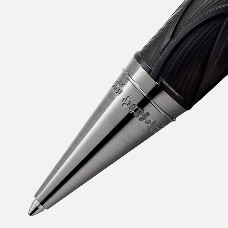 Chaque petits détails présent sur ce stylo sont en rapport avec cet hommage. Tout d'abord, le stylo prend la forme d'un bâton de randonnée ancien et sa couleur noire n'est pas choisi au hasard puisqu'elle vient rappeler l'obscurité des bois, qui est un décor que l'on a beaucoup dans leurs contes de fée. Sur l'ensemble du stylo, vous remarquerez un motif ondulé. Ce motif représente les cheveux de Raiponce et aussi les racines, les frères Grimm considérant leur travail comme une « recherche dans les racines ». Vous verrez que les dimensions et le poids de ce stylo vous seront tout particulièrement agréable. Il pèse 54.14 g et mesure 139 mm de hauteur et 16.20 mm de diamètre. Sur la partie haute du stylo, nous avons une agrafe platinée. Elle est en forme de bâton de bois et elle a été réalisé avec minutie car elle révèle le profil des deux frères. Et au sommet du stylo, il y a le célèbre emblème de Montblanc qui est en résine précieuse blanche.