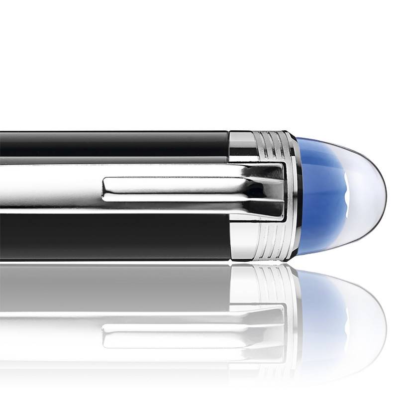 Afin de vous garantir son authenticité, le modèle est gravé du nom de la marque ainsi que de son numéro de série au niveau de l'agrafe. Cette dernière arbore d'ailleurs un joli Platinium qui contrastera à la perfection avec son corps noir. Le dessus du capuchon abritera un superbe dôme translucide de couleur bleue sous le fameux logo Montblanc qui n'est pas sans rappeler la terre au-dessus de l'horizon lunaire. Son poids total est de 28.03 grammes.