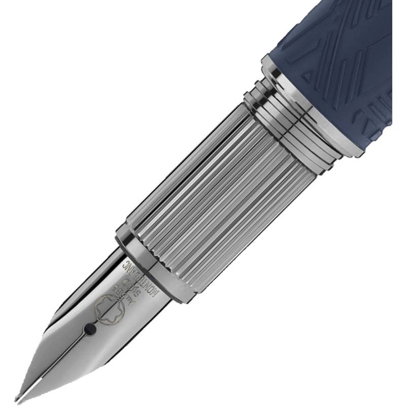 Inspirée de l'au-delà du ciel et des étoiles, sa collection StarWalker SpaceBlue vous emmène dans un voyage à travers les galaxies avec des créations raffinées et futuristes tel ce sublime stylo plume. Celui-ci saura vous séduire par la finesse de son design et deviendra à coup sûr votre allié pour une prise de notes agréable. Il arbore un corps et un capuchon en résine précieuse de couleur bleue qui se parent d'un design sophistiqué inspiré des figures de Widmanstätten. Tous ses éléments en métal sont dotés d'un revêtement en ruthénium foncé qui leur confère une couleur grise saisissante en assurant dureté et grande résistance. Ce stylo de 28,30 gr est rehaussé par l'emblème Montblanc sur un sous-dôme bleu au sommet du capuchon. Fabriquée à la main, sa plume de 0,62 mm de pointe est faite en or blanc 585/1000 (14K) ruthénié.
