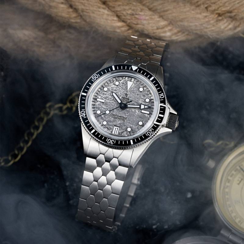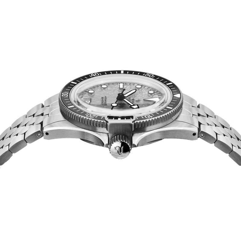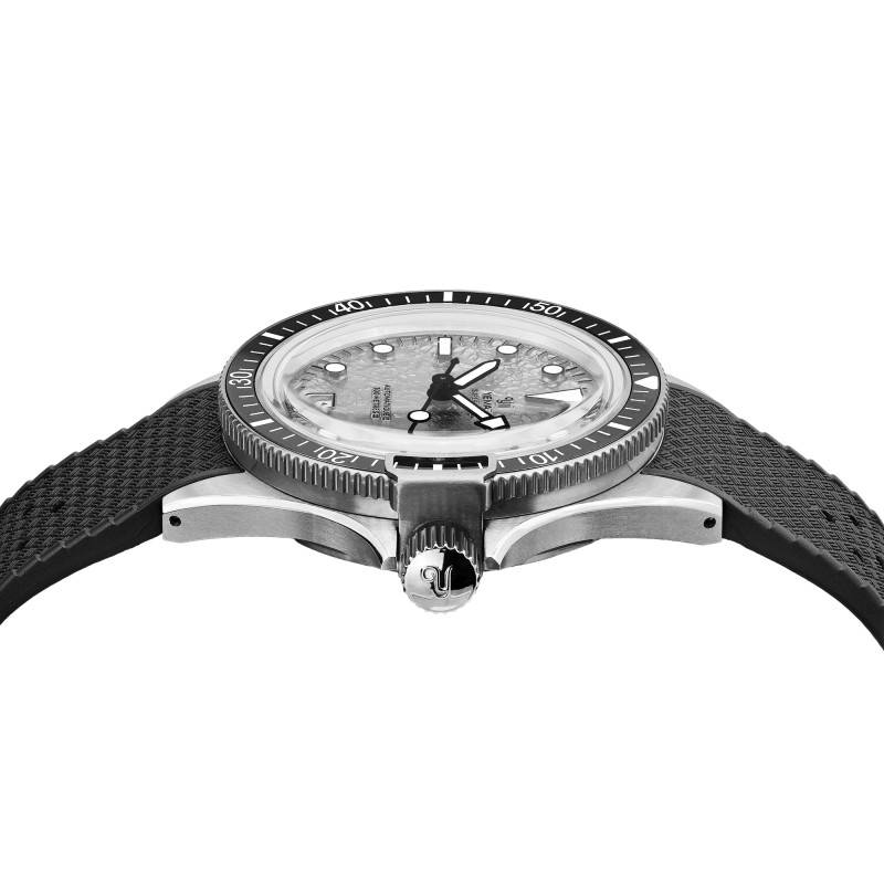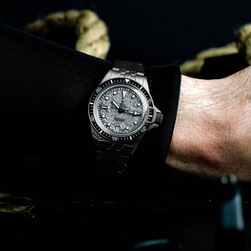 Inspiré par la surface minérale de la Lune, le cadran en titane texturé est façonné grâce à une technique de pressage à l'huile appliquée sur une base sablée. Il en résulte un relief subtil qui capte la lumière et évoque le reflet du clair de lune sur la mer. Ses éléments lumineux en SuperLuminova garantissent une lecture facile des heures, des minutes et des secondes, même dans les conditions les plus obscures. Les aiguilles luminescentes se détachent avec élégance sur le fond subtilement travaillé, accompagnées d'index finement dessinés et d'un chemin de fer des minutes, formant un ensemble harmonieux et précis. Un guichet date se fond parfaitement dans le cadre, accentuant la fonctionnalité sans compromettre le design. La clarté visuelle du cadran se voit renforcée par le verre saphir, anti-reflet, pour une vision suave jour et nuit.