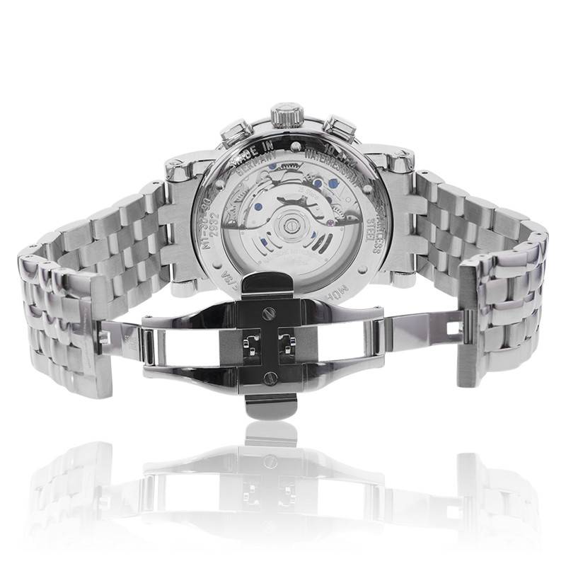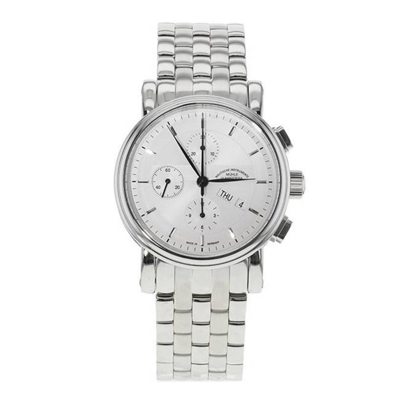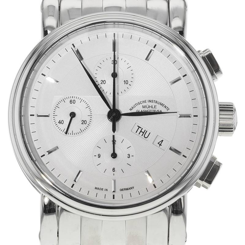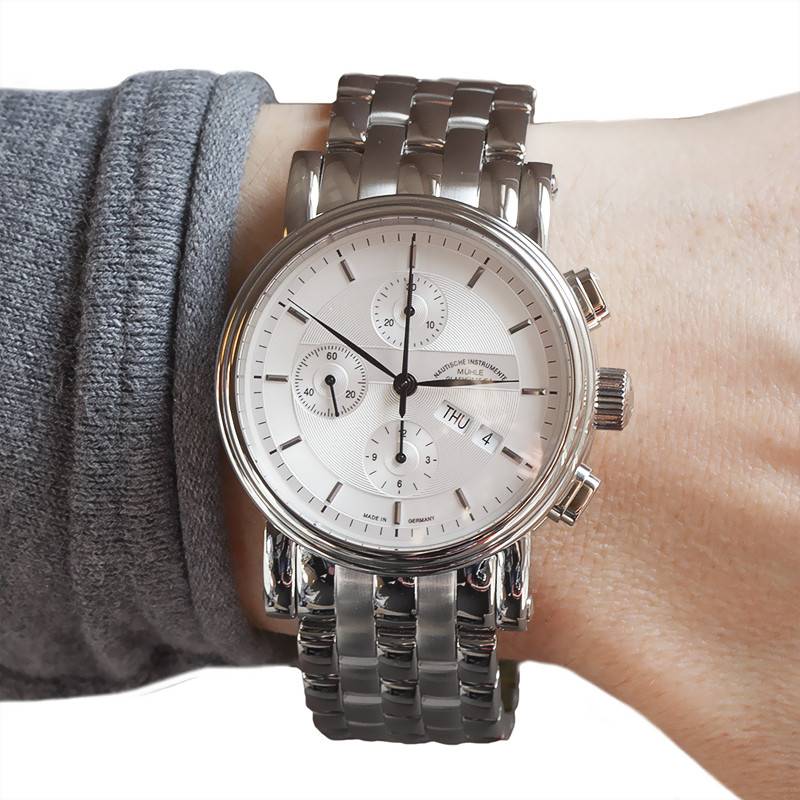 Le MouvementCette montre abrite un mouvement à remontage automatique Muhle 9408, basé sur le célèbre mouvement suisse ETA Valjoux 7750. Ce calibre de 25 rubis indique heures et minutes, les secondes dans un compteur petite seconde dédié et la date et le jour dans deux guichet. Il est équipé du dispositif Stop Seconde qui permet un réglage de l'heure à la seconde près. Il dispose de la fonction chronographe avec un compteur 30mn et un compteur 12h. Ce mouvement a une fréquence de 28.800 A/h, pour une réserve de marche de 48 heures.