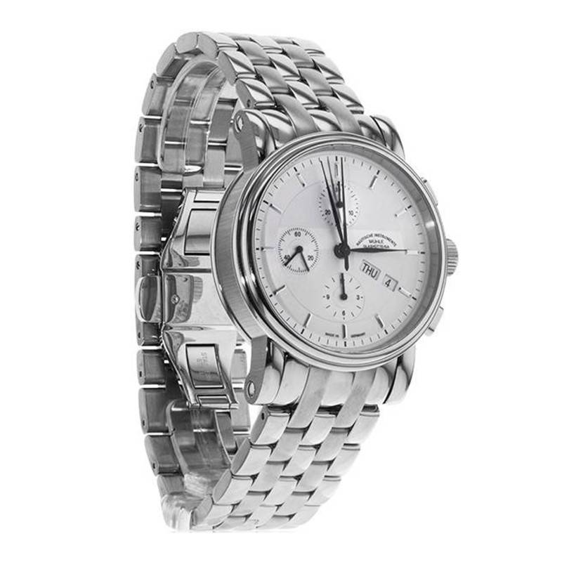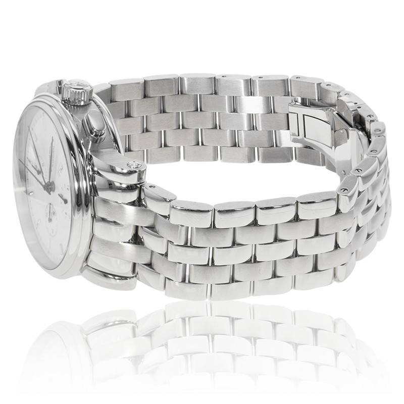 Le cadran de couleur blanche, guilloché en son centre, présente des aiguilles noires, des index appliqués argentés, deux guichets pour la date et le jour de la semaine à 4h et trois compteurs. Le compteur petite seconde se trouve à 9h. Pour le chronographe, le compteur 30mn est placé à midi et le compteur 12h à 6h. Sur la droite du boitier se trouvent la couronne vissée et deux boutons poussoirs pour le chronographe.