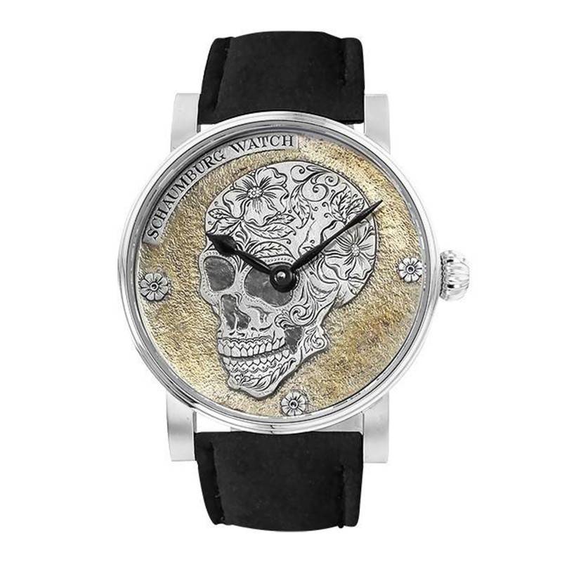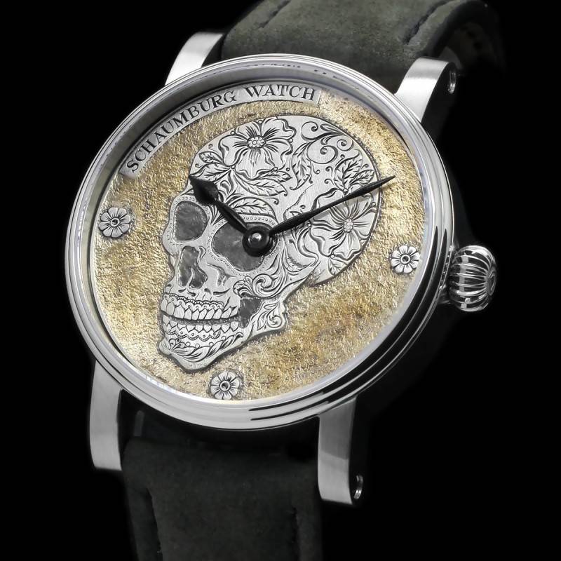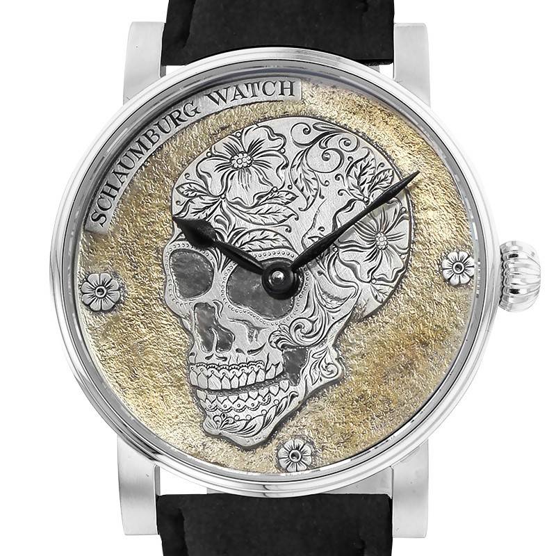 Pour les passionnés d'horlogerie, d'esthétisme et d'art, voici un véritable objet de désir et de beauté que la marque suisse Schaumburg vous présente ici... De la collection Limited edition's, cette pièce absolument unique, par sa platine d'argent ciselée à la main, a été fabriquée à 19 exemplaires... Détenant un mouvement automatique suisse de qualité que vous pourrez par ailleurs contempler via son fond de boîtier transparent, ce garde temps « squelette » joue sur « le » mot, en livrant une superbe représentation en sa platine d'un crâne argenté délicatement ciselé, de trois quart et spectaculairement orné de fines fleurs sur un fond doré et texturé. Le temps sur ce modèle emporte tout certes, mais avec raffinement !