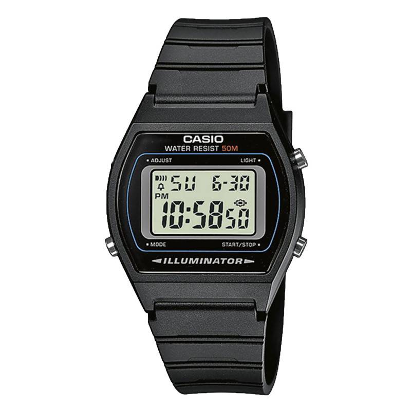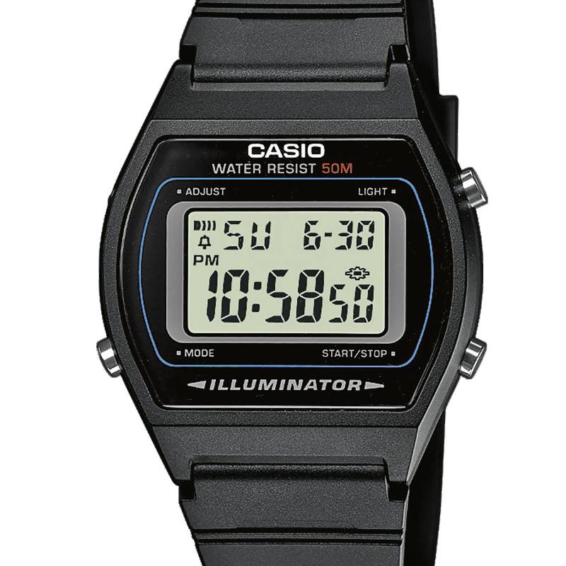 Cette montre à quartz avec un cadran à cristaux liquides présente un boîtier et un bracelet en résine noire. Les dimensions du boitier rectangulaire sont : 38,90 x 35,00 x 9,40 mm. Elle étanche jusqu'à 5 atmosphères soit 50 mètres.