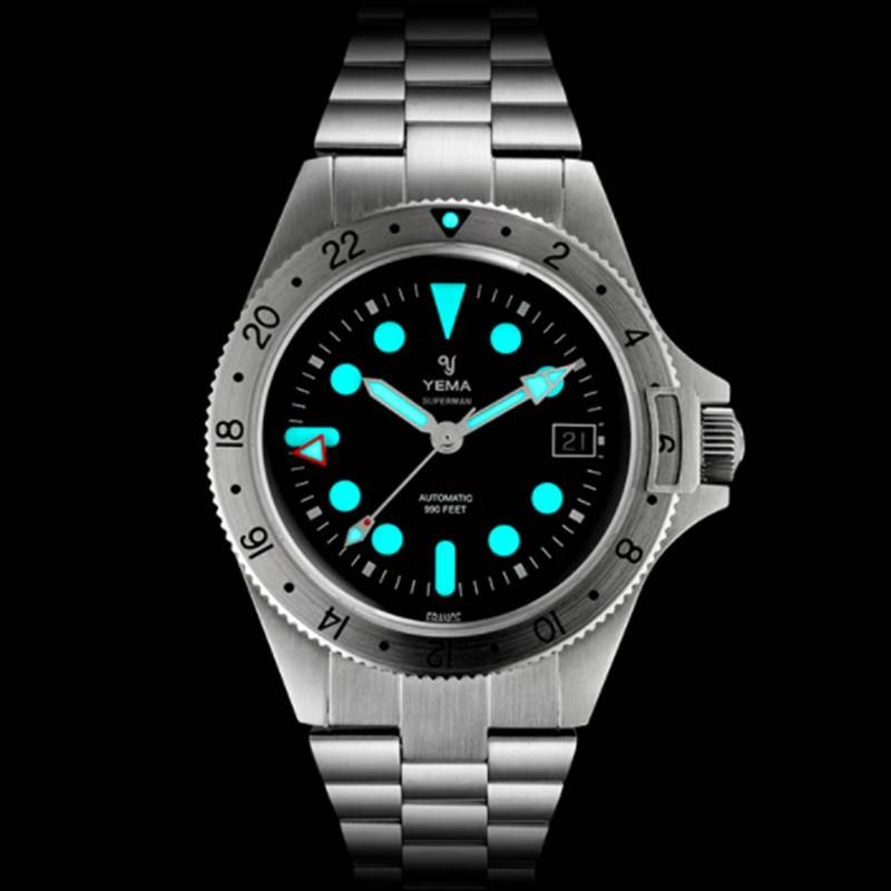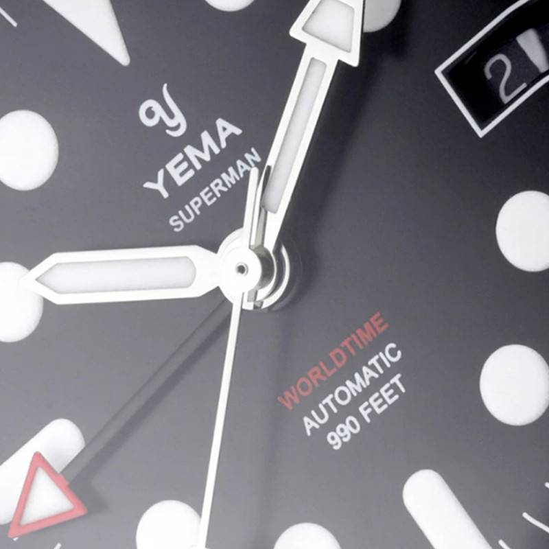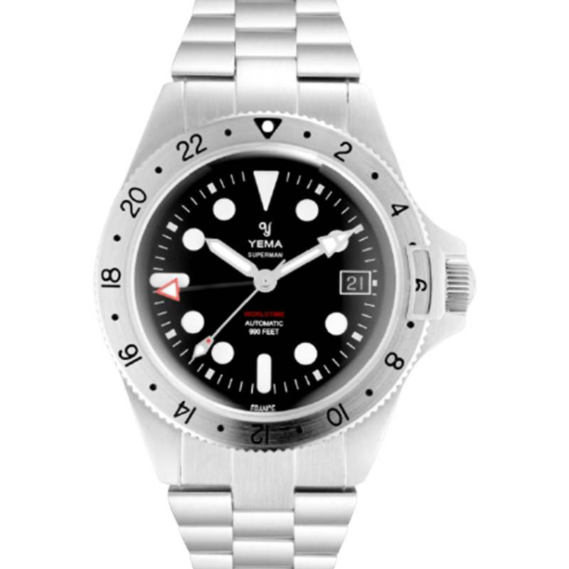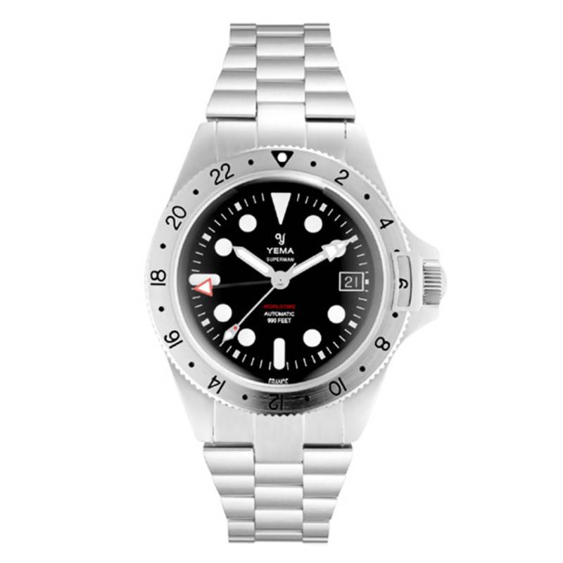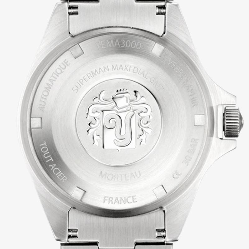 Ce modèle Superman Worldtime Steel est le premier à être équipé du nouveau calibre de la marque GMT YEMA3000. Offrant de grandes performances, ce mouvement automatique fiable et précis possède 29 rubis ainsi qu'une fréquence d'oscillation de 28 800 alternances par heure. Il permet de lire les heures, les minutes, les secondes, la date ainsi que 3 fuseaux horaires. Notez que sa réserve de marche est de 42 heures.