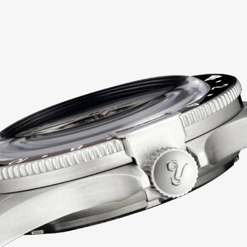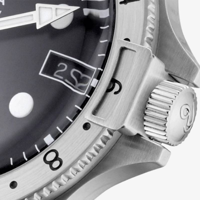 De forme ronde, le cadran noir se présente sous une finition matte. Afin d'assurer une lecture optimale en toutes circonstances, les index de forme arrondie sont surdimensionnés. Notez que les marqueurs de temps placés à 6, 9 et 12 heures se présentent sous une forme différente. Pour plus de précision, un chemin de fer des minutes se place sur le pourtour du cadran. La couleur blanche des index et le noir du cadran offrent un parfait contraste. Au centre, vous trouverez 4 aiguilles. Les aiguilles de type glaive et épée parcourent les heures et les minutes. Pour ce qui est des secondes, elles sont indiquées à l'aide de l'emblématique trotteuse chromée habillée d'une tête en forme de pelle. Par ailleurs, une aiguille GMT noire vêtue d'un triangle de couleur rouge et blanche permet de lire jusqu'à 3 fuseaux horaires à l'aide de la lunette tournante. Alors si vous aimez voyager, ce modèle est fait pour vous ! Dans le but de garantir une parfaite lisibilité dans l'obscurité, les index et les aiguilles possèdent un traitement Superluminova. Par ailleurs, un guichet date se loge à 3 heures.